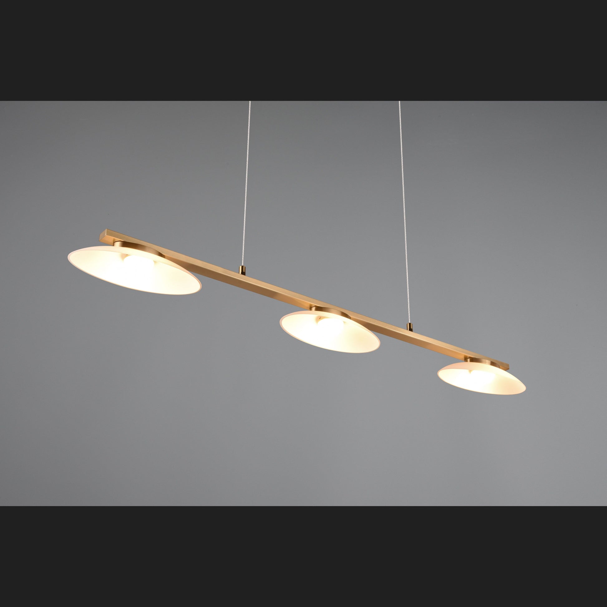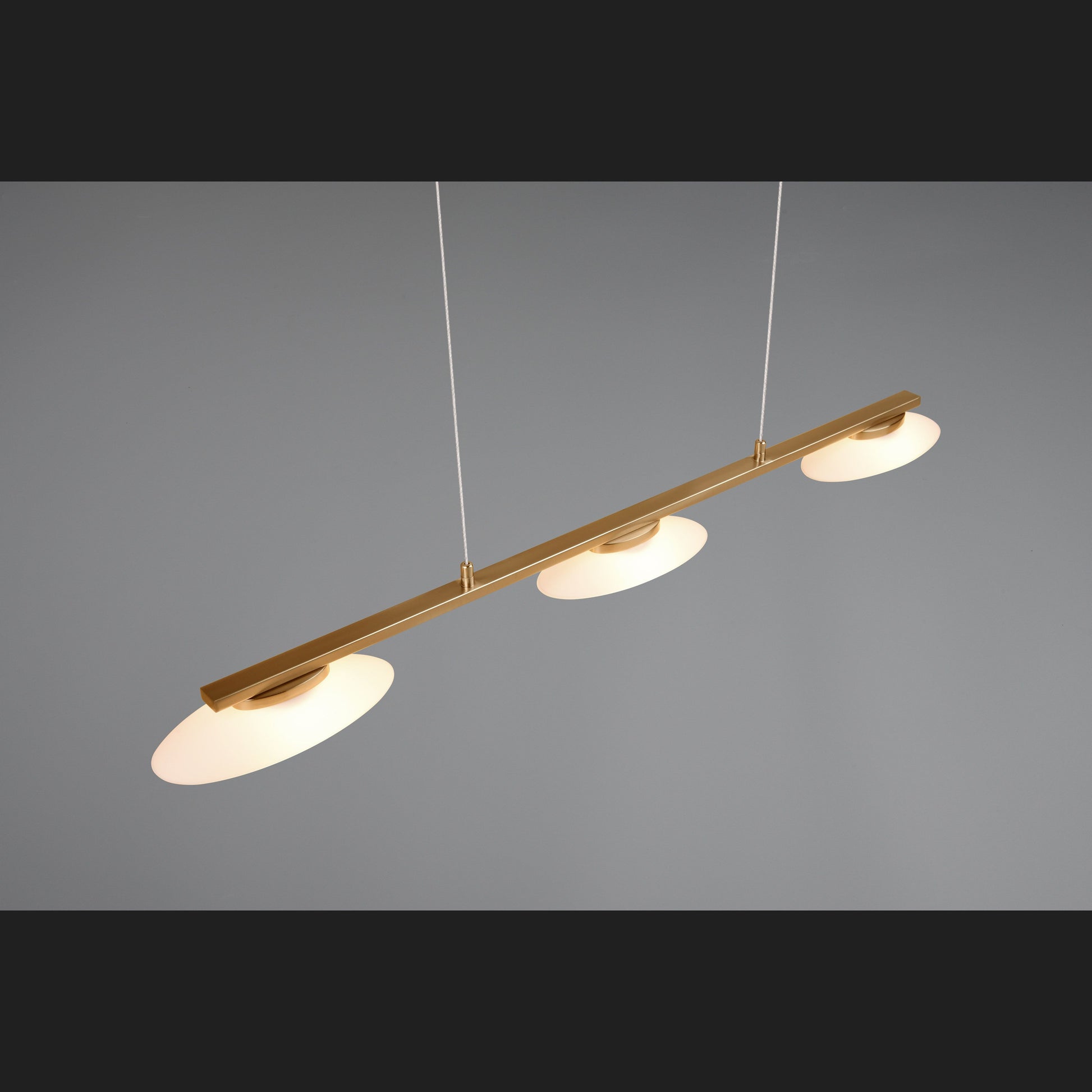Brass-coloured lights with glass can be used in a variety of ways and demonstrate a sophisticated touch - as does the minimalist, timeless MERTON pendant light. The three glass elements gently distribute the light into their surroundings, making the luminaire a suitable light source above a dining table or kitchen counter. The integrated SWITCH dimmer also allows the brightness to be adjusted in three stages (100%, 50%, 25%) using a conventional light switch. Let your dining table shine as a central element in the dining area! The pendant light creates a harmonious overall look thanks to the white glass and matt brass metal. The luminaire also features modern LED technology, which is characterised by high light quality and energy efficiency. Compared to conventional halogen light sources, up to 80% of energy costs can be saved. With LED light sources, you also benefit from a long service life and low heat generation while protecting the environment.