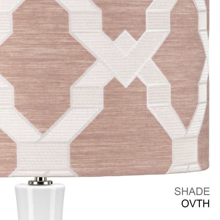 The Milo White ceramic table lamp. This portable is completed with a 14" Laminated Drum shade, Piazza Summer Breeze pattern, with Polished Nickel metalwork. LSUK097