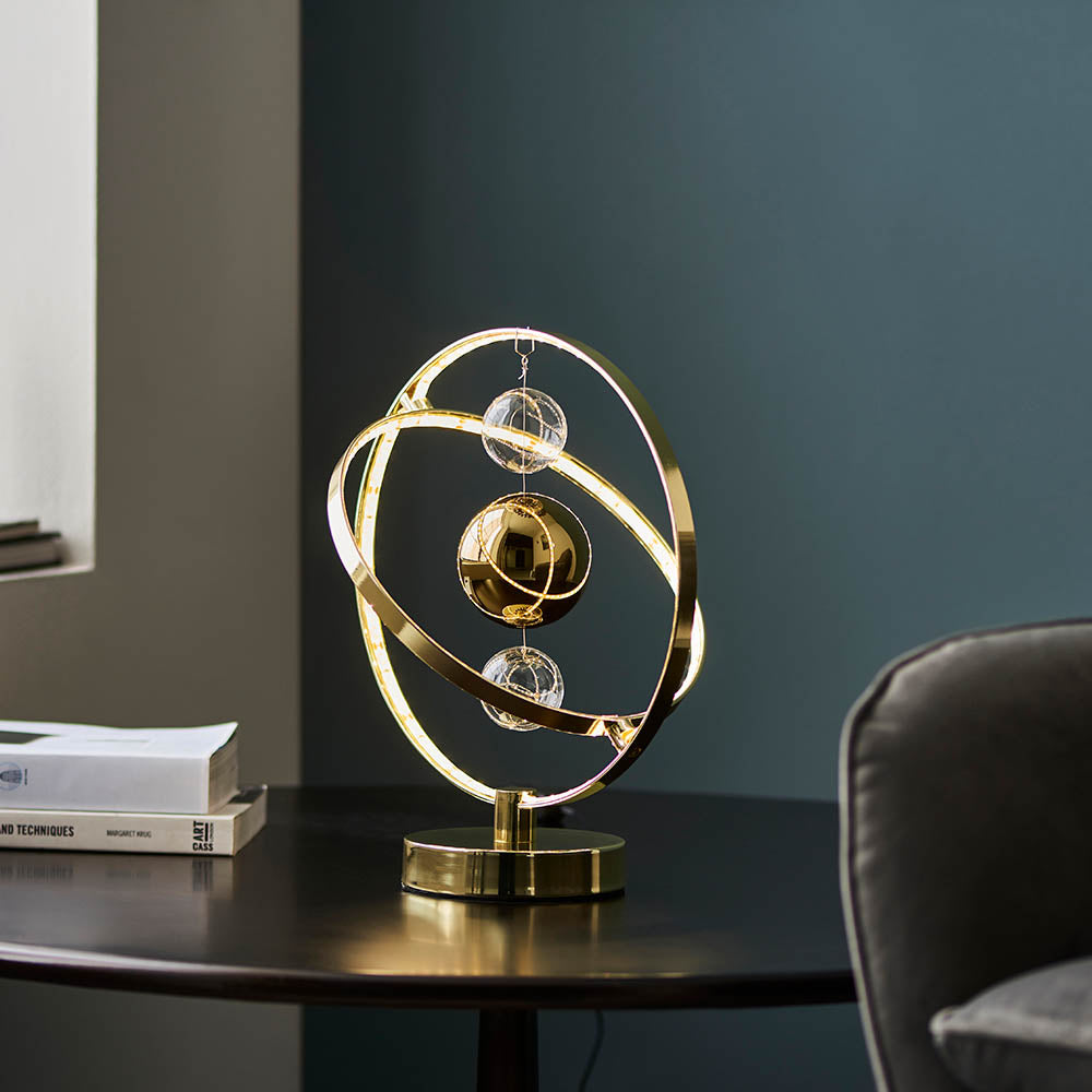 A striking LED table lamp with a gold effect plated finish with a mix of clear and gold spheres suspended at various heights within the integrated LED outer rings, creating a stunning modern design.