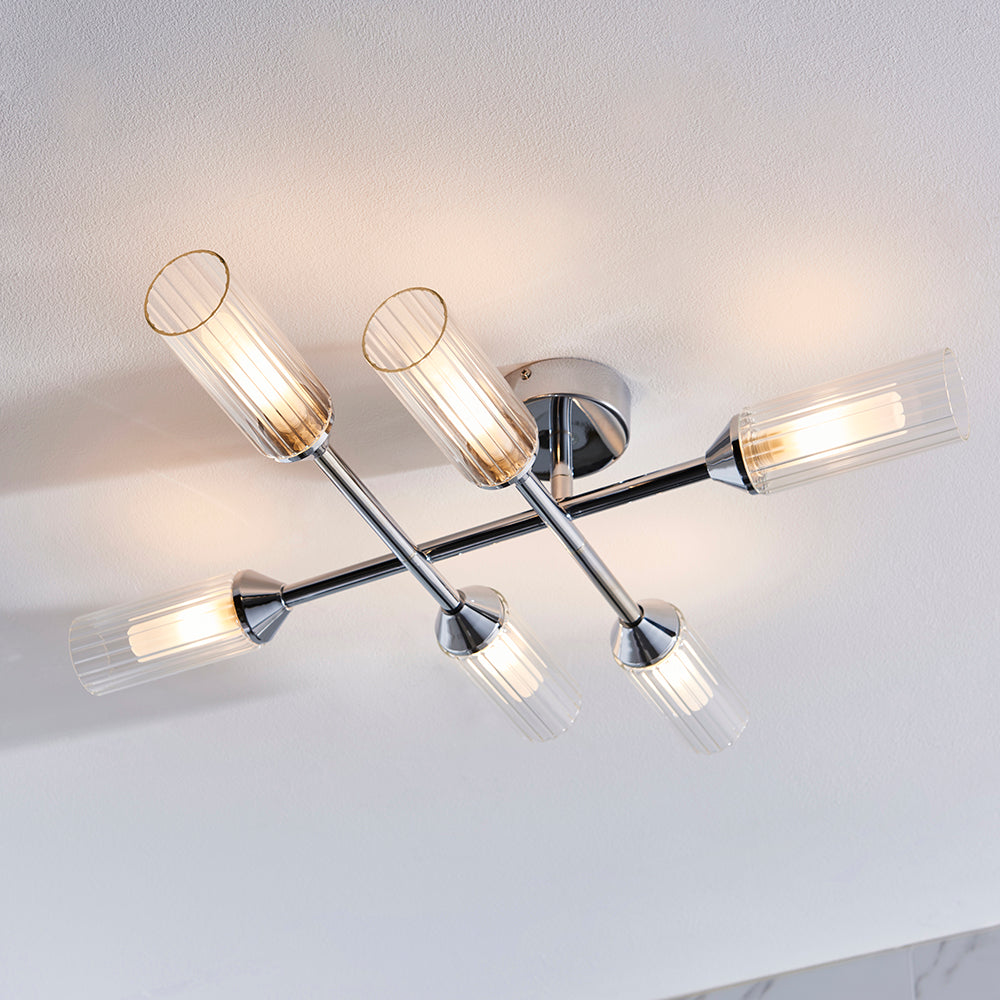 Inspired by geometric forms with a decorative twist, this IP44 rated ceiling light is the perfect contemporary addition to your bathroom. The polished chrome metalwork would pair seamlessly with similar-coloured brassware, and the ribbed glass shades add a touch of timeless detailing. Combine with matching items from the same range for a distinctive contemporary look.