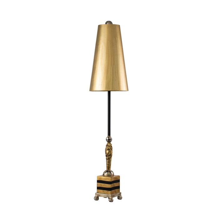 The Noma Luxe table lamp has a Gold and Black striped square base raised on small round Silver Leaf feet. The metal stem of this portable is embellished with sculpted palm-inspired element, and ball finial. It is topped with a Glazed Gold Leaf shade. LS448
