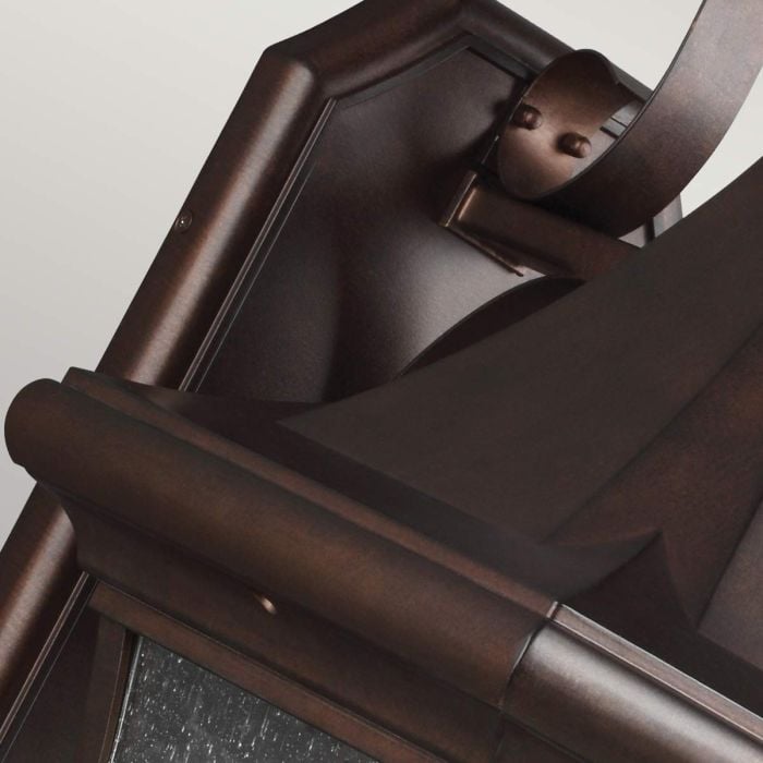 RETIRING COLLECTION MODEL - CHECK STOCK AVAILABILITY. The Oakmont outdoor collection boasts incredible details, from the steeply pitched roofline and softly curved glass panels to an angular back plate, lovely curved arm extension and classic finials. A Patina Bronze finish paired with clear seeded glass give this stately collection old world charm. Cast aluminium construction ensures durability.