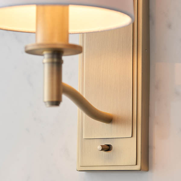 The Ortona wall light is finished in a matt antique brass effect plate with a vintage white faux silk shade. Operated with a toggle switch, dimmable and suitable for use with LED lamps. Matching items available.