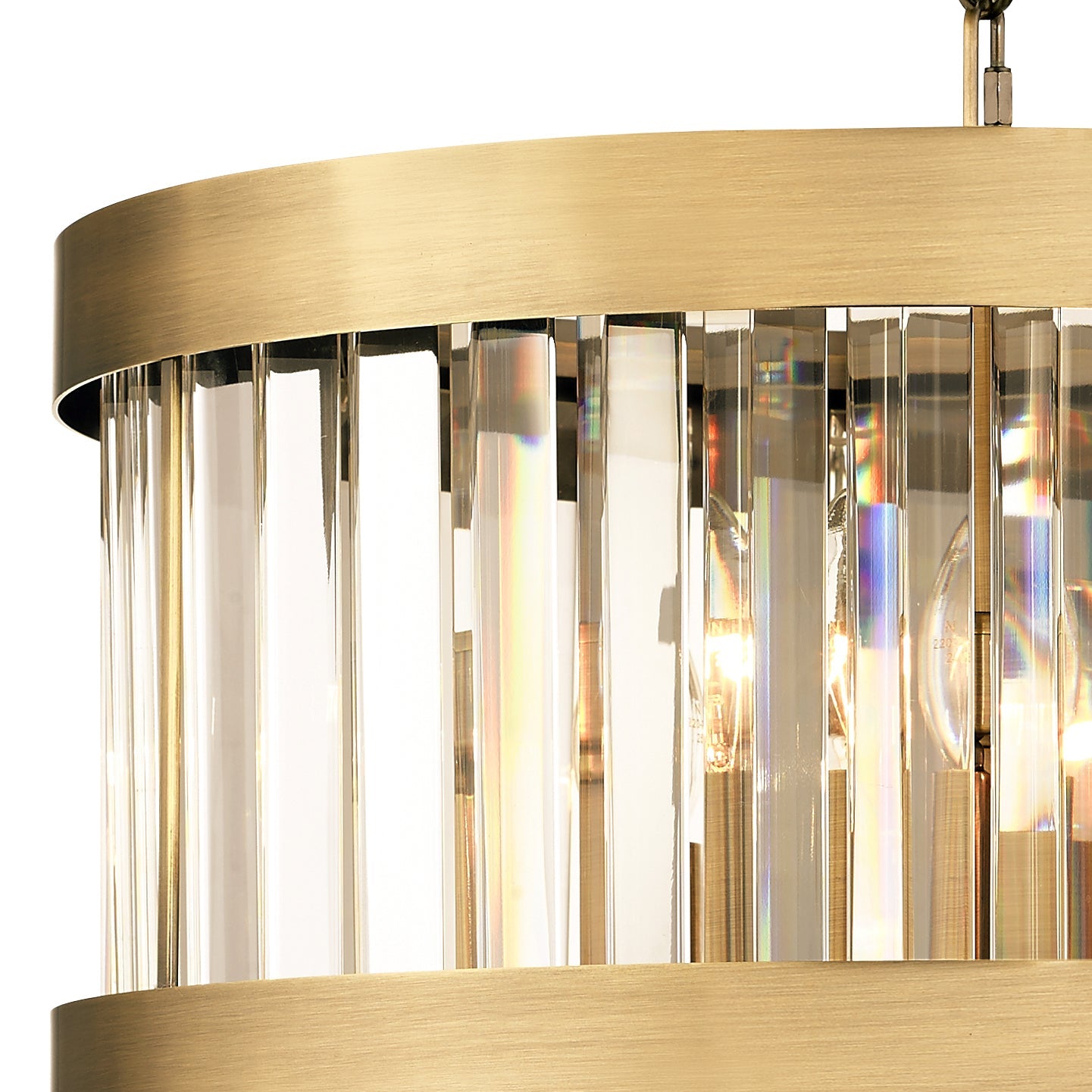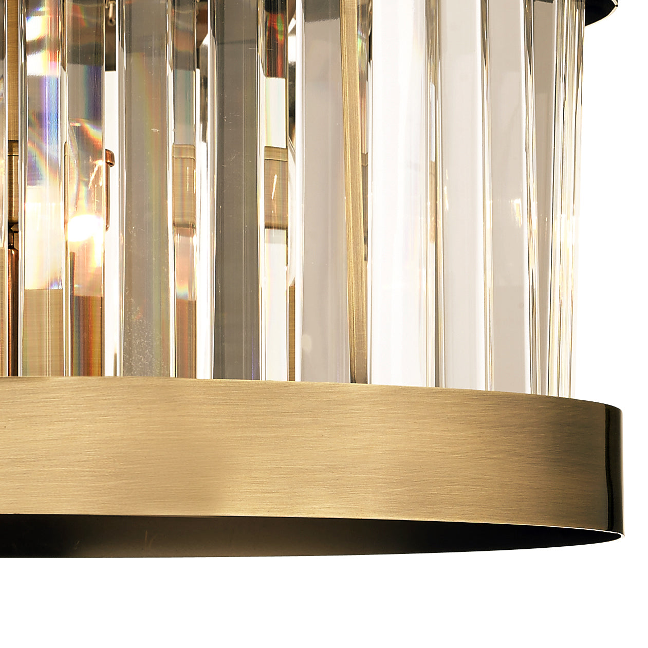 The Pandora 3 Light in Antique Brass is a statement ceiling light comprising of sparkling crystal bars encased in two thick antique brass bands. The elegant band of crystal reflects the light beautifully when illuminated for a glamorous lighting effect. The Pandora is fully LED Compatible and available in a number of sizes, a matching wall light and in Satin Chrome.