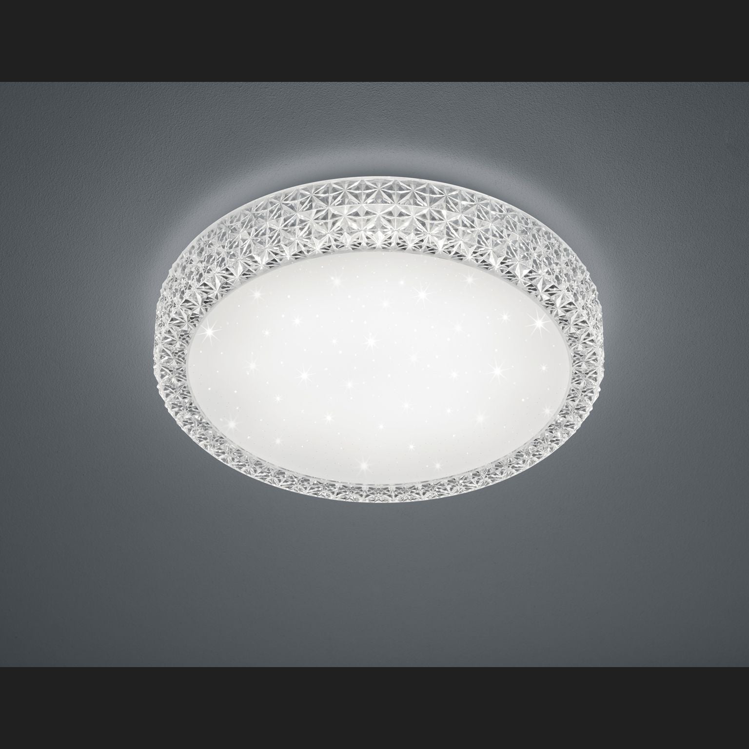 The PEGASUS ceiling light provides good, even illumination in your room. The glitter effect on the lampshade gives the Pegasus ceiling light that certain something. It also has a built-in SWITCH dimmer. With this dimmer, the ceiling light can be dimmed to three different brightness levels using a conventional wall switch, increasing the feel-good factor in your rooms. The diameter is 40 cm. The PEGASUS luminaire made of white acrylic is contrasted by the stylishly polished white edge, which gives the luminaire an elegant and high-quality character. Small stones on the top create an atmospheric lighting ambience In addition, the luminaire features modern LED technology, which is characterised by high light quality and energy efficiency. Compared to conventional halogen lamps, up to 80% of energy costs can be saved. In addition, LED light sources have a long service life, produce less heat and protect the environment.