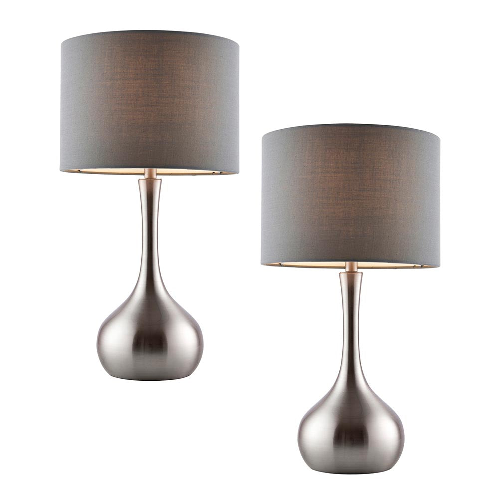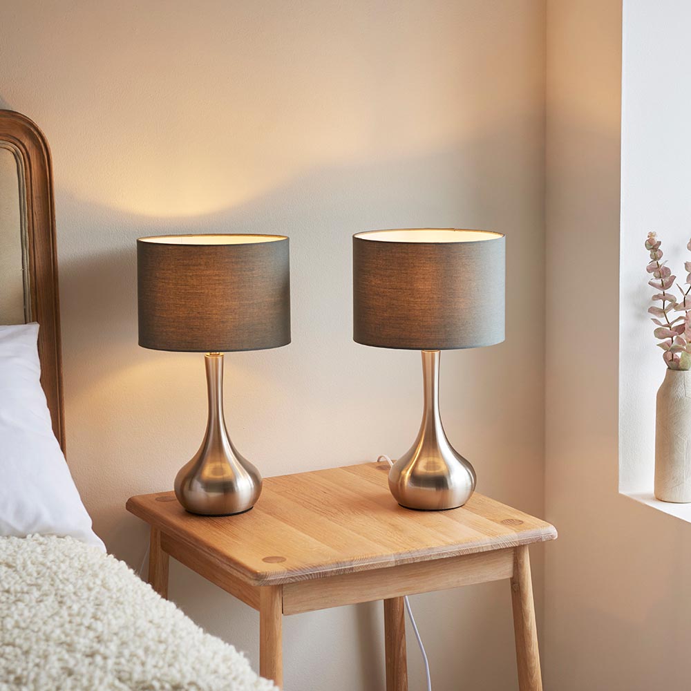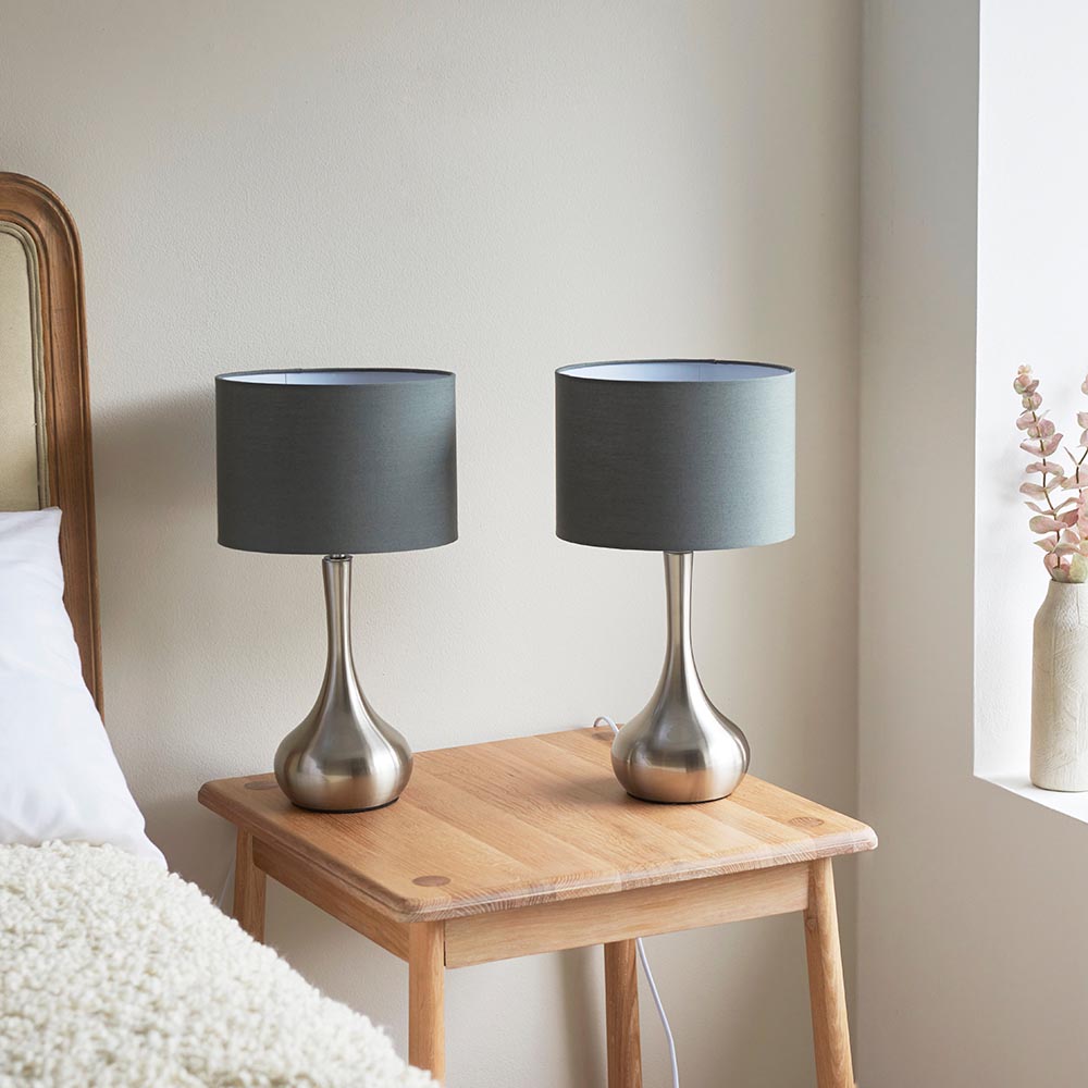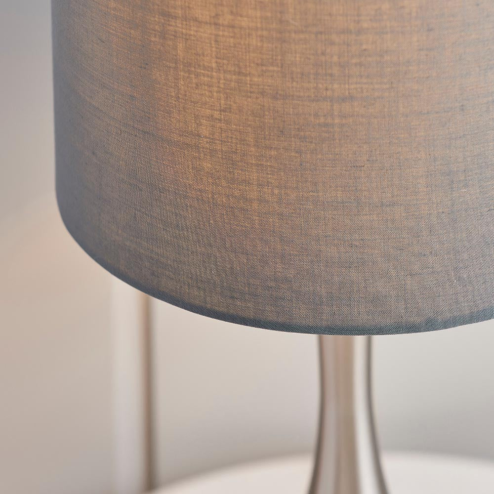 The Piccadilly is a stylish table light with a satin nickel plate and a dark grey fabric shade. Clever touch technology for operating and dimming. Other colour options available