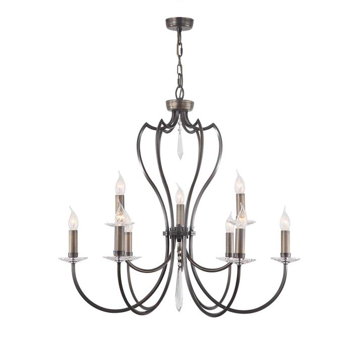 RETIRING COLLECTION MODEL - CHECK STOCK AVAILABILITY. The stunning Pimlico range is a beautifully crafted family of products using fine square tubes unusually curved on their edges. Partly made of solid brass, the Pimlico features fine cut glass sconces and droplets to accent the Dark Bronze finish. Optional LS162 or LS200 clip shades are available if required.