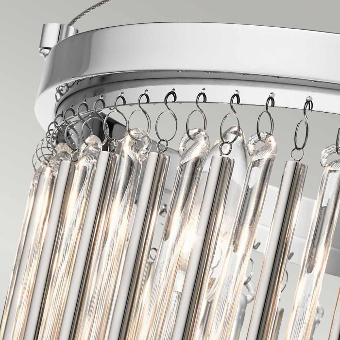 Piper mixes modern with femininity with its delicate glass bead accents. Making this a focal point in any modern room is the linear detail in the clear glass and metal rods finished in Polished Chrome.