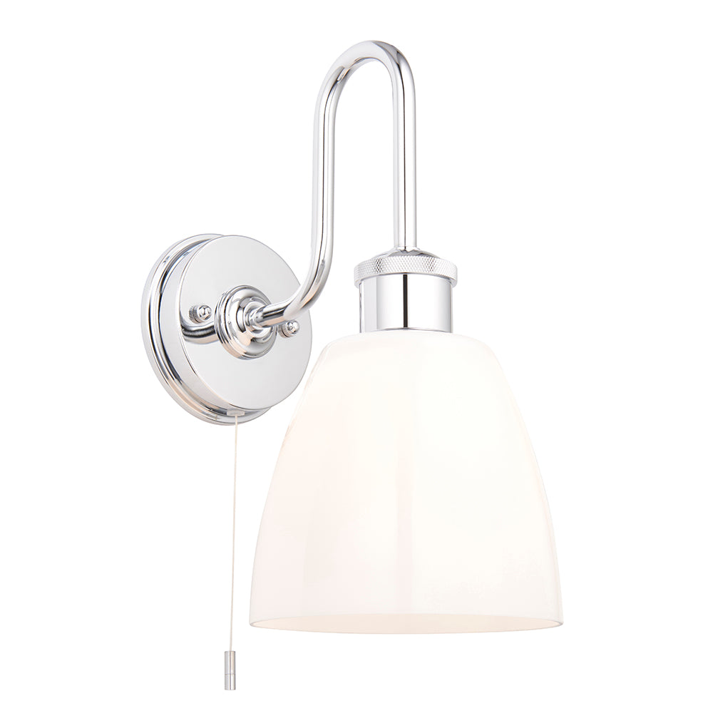 This classic modern IP44 rated wall light features an elegant swan neck design combined with knurled details in polished chrome with an opaque shade in gloss opal glass.