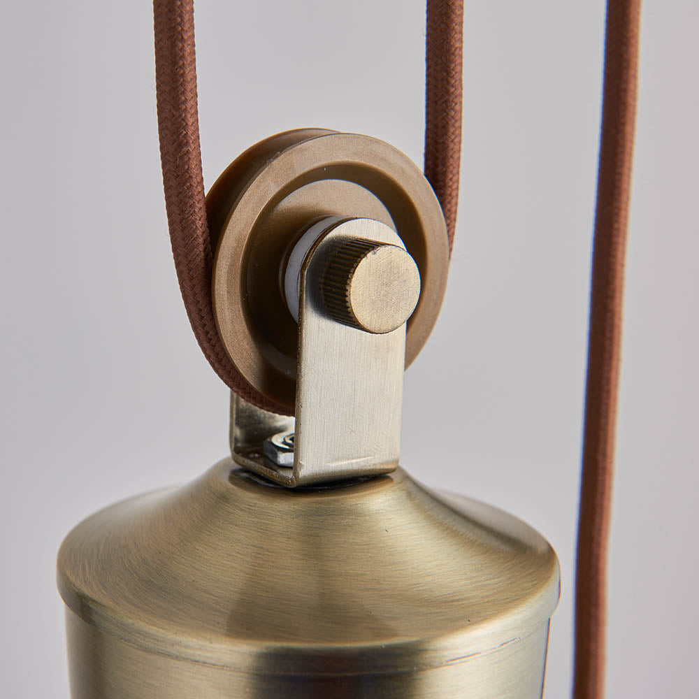 A rise and fall ceiling pendant with an antique brass finish. Height of the light can be adjusted after installation from 92 cm minimum and has a maximum height of 198 cm. For rooms with higher ceilings and for use in dining areas