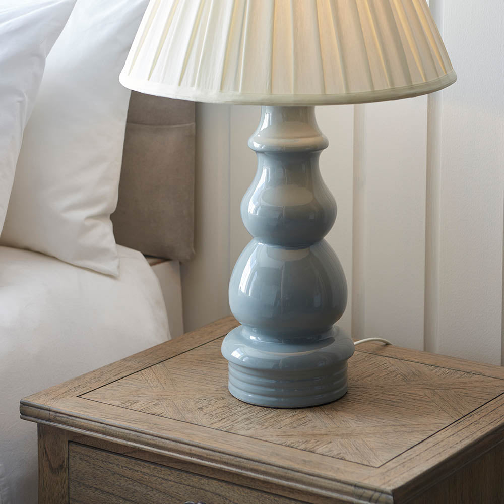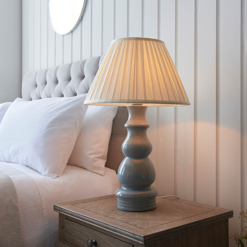 *Incorporates 10% saving when base and shade bought together.Ceramic table lamp finished in luxurious gloss blue grey glaze featuring a beautiful handmade box pleat cream 16 inch tapered shade.