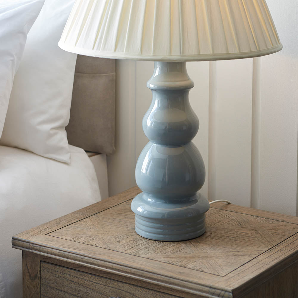 *Incorporates 10% saving when base and shade bought together.Ceramic table lamp finished in luxurious gloss blue grey glaze featuring a beautiful handmade box pleat cream 18 inch tapered shade.