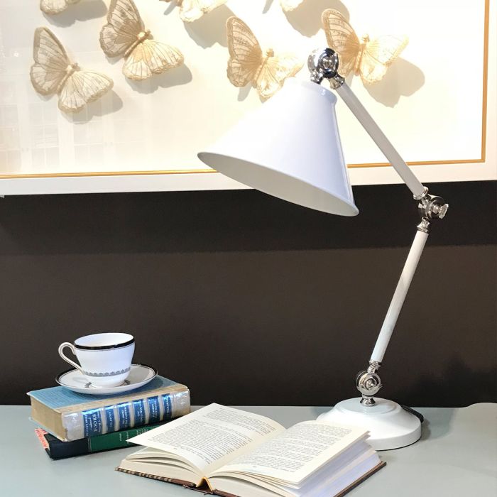 The more petite Provence Element table lamp was added to this collection offering smaller proportions and a dual finish. This portable White base has Polished Nickel accents.