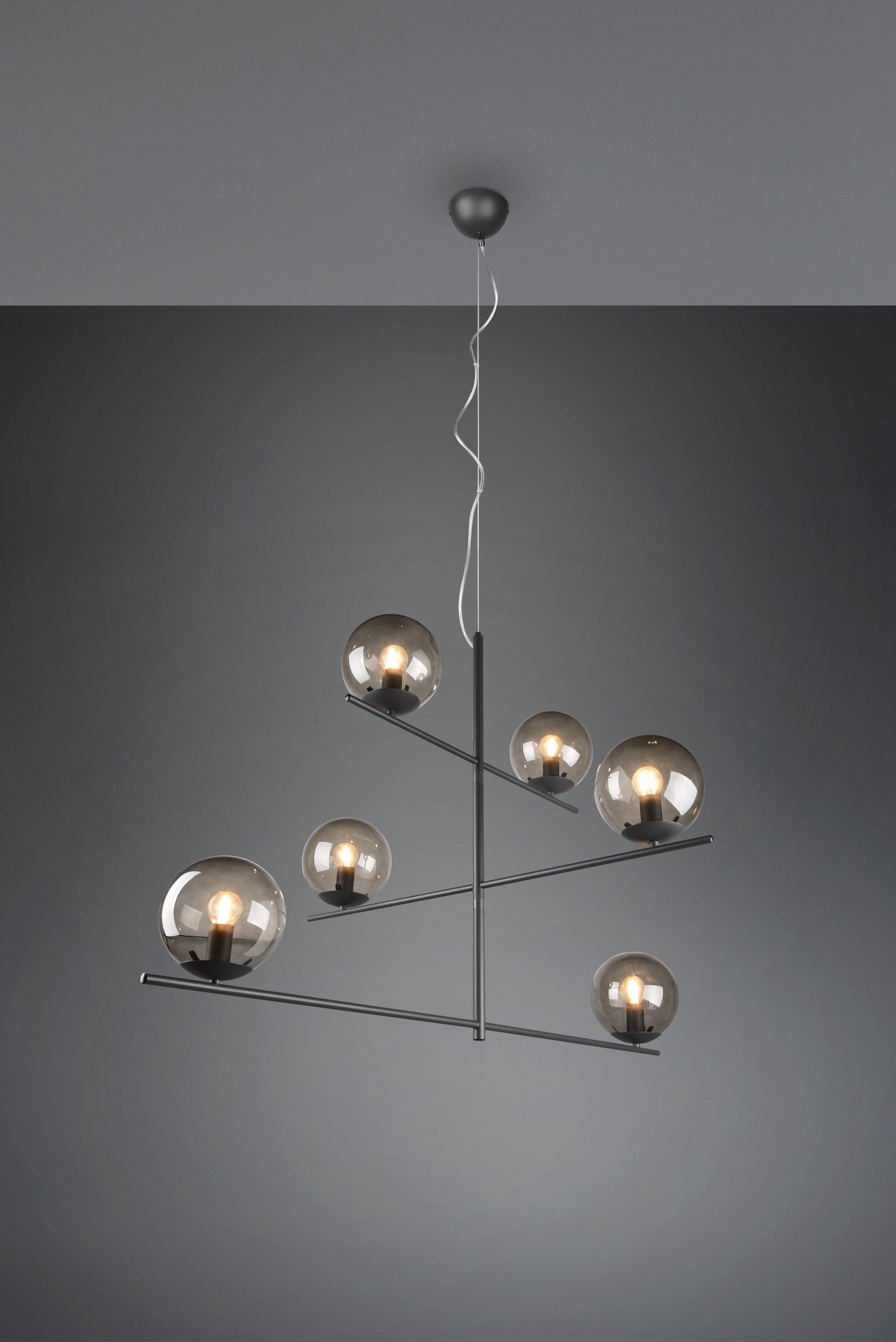 Simple and absolutely stylish! Whether a simple, straightforward interior style or something more playful – the luminaires of the PURE series provide simple decorative accents to add a touch of elegance to any look. The simple style is absolutely contemporary and can be combined with both striking and discreet elements. The swivelling elements of the six-flame pendant luminaire can be individually aligned. Thus, the luminaire is perfect to illuminate the dining table and to underline the own living style. The purist-minimalist design of the PURE is a mix of noble metal optics in anthracite combined with smoke-coloured glass. For energy-saving lighting, it is recommended to use an LED illuminant. These are an optimal alternative to conventional halogen lamps and stand for a high quality of light and energy savings of up to 80%. In addition, LED lamps help you benefit from a long service life, low heat generation and at the same time protect the environment.