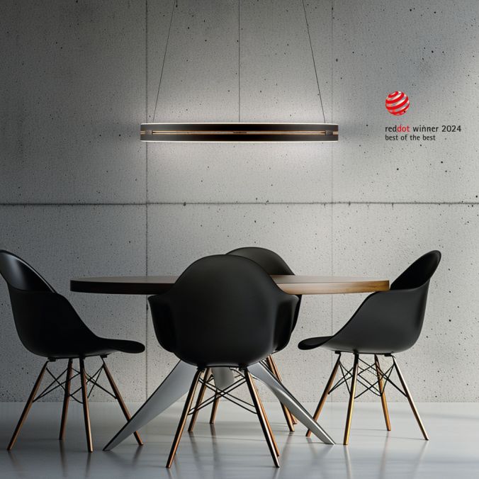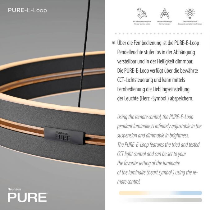 Experience the magic of light with the PURE E-Loop LED pendant light. With its elegant black, matte design with oiled oak wood accents and innovative features, this light sets new standards in lighting and technology. The pendant light combines beauty and functionality in perfect harmony. Thanks to the unique e-LIFT® function, a technology specially developed by the renowned Paul Neuhaus GmbH, the light's height can be adjusted electrically and effortlessly. The motor is discreetly located in the ceiling box, so the height adjustment happens as if by magic. As part of the exclusive PURE brand by Paul Neuhaus, this pendant light stands for the highest quality and outstanding technology. You can rely on the reliable performance and durability of this light. With the CCT color temperature control, you have full control over the light color. Adjust the color temperature continuously from warm white 2700K to neutral 5000K and create the perfect atmosphere for every occasion. The light is also continuously dimmable, so you can adjust the brightness exactly as you like. With the practical wireless remote control, you can control your lighting from anywhere in the room, while the memory function allows you to easily recall your last selected settings. A white remote control is included as standard. A black remote control including a black wall mount is also available in our online shop for an additional charge. We stand by our commitment to quality and reliability. Immerse your room in a fascinating play of light and experience the outstanding technology of this LED pendant light. Be inspired by its modern design, electrically height-adjustable function, and innovative features. Bring magic and style into your home and benefit from a long-lasting, high-quality lighting solution. Please note that the PURE pendant light may only be installed on horizontal ceilings!