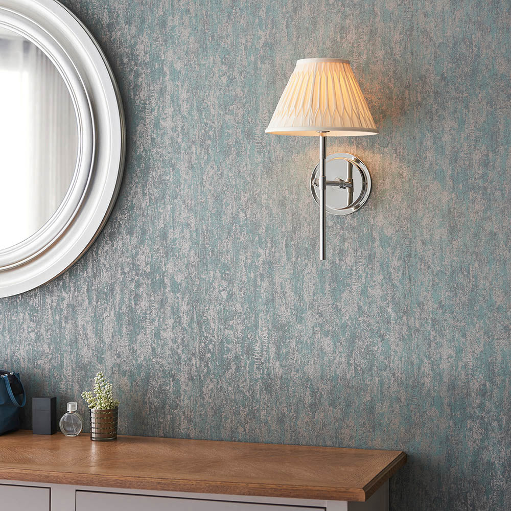 A contemporary take on a classic style, striking lines in clean bright nickel plate create this elegant and timeless wall light. Featuring a beautifully handmade ivory silk 10 inch double pinch pleat tapered shade.