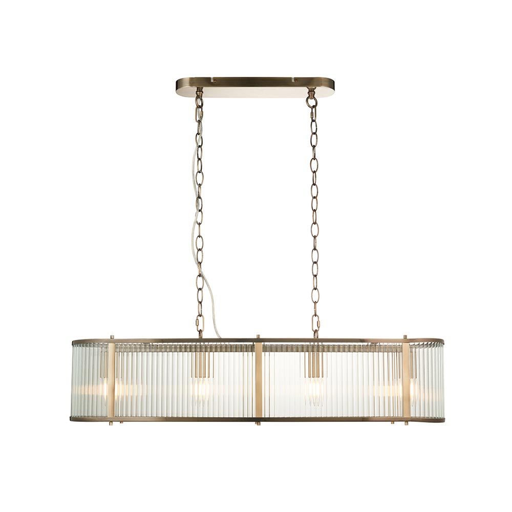 Timeless classic linear pendant with antique brass plated metalwork, the clear ribbed glass panels shade and diffuse the light. Height adjustable chain means this can be perfectly placed to illuminate dining rooms and living spaces. Matching flush and pendant lights also available to create a co-ordinated look.