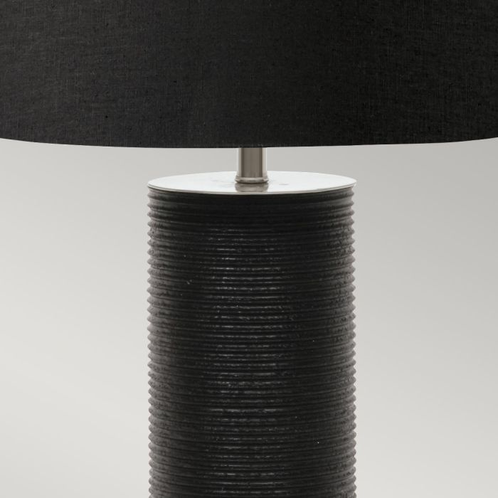 The Ripple Black resin table lamp has Brushed Nickel accents. This portable includes a Black faux linen hard-backed shade. Made in England. LS3018