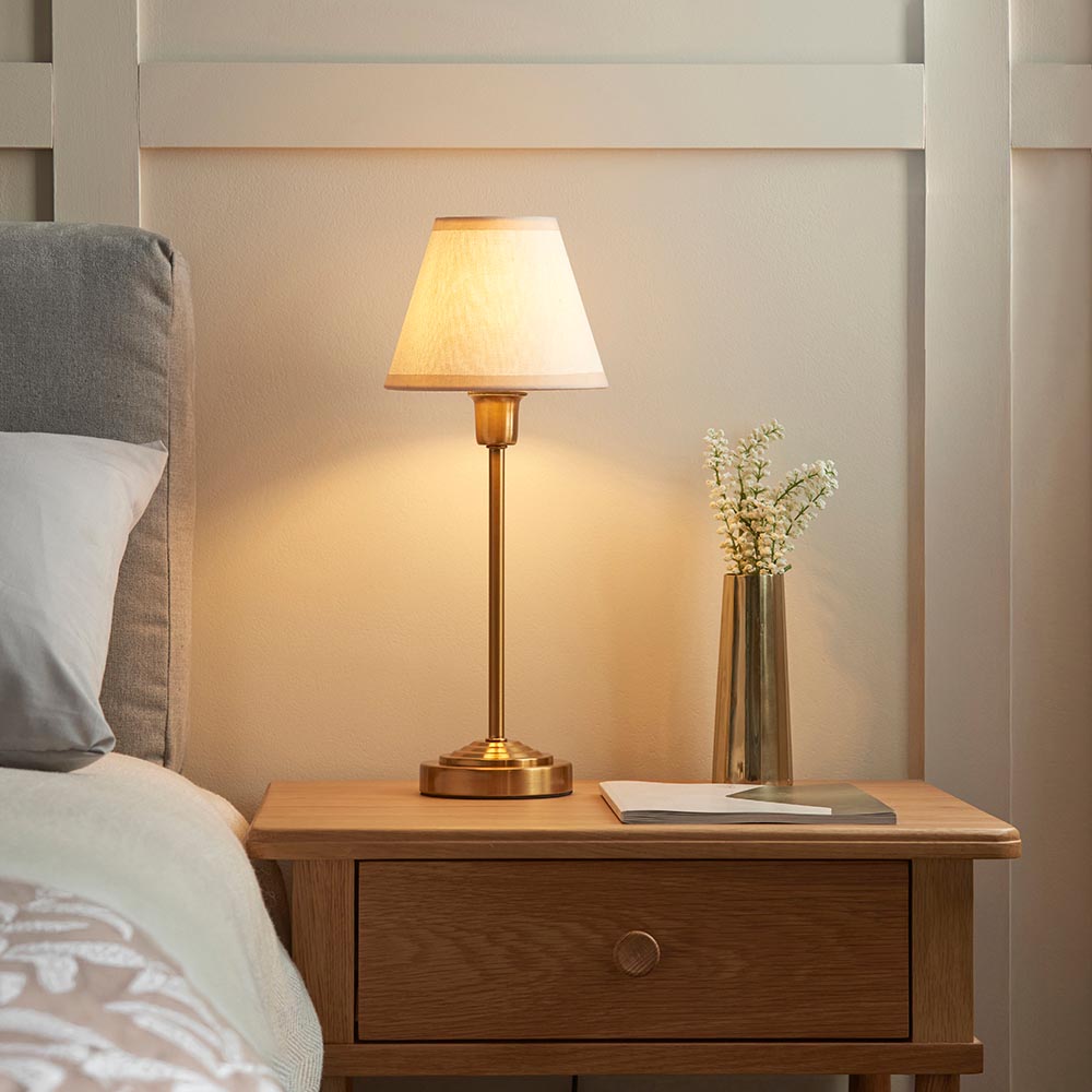 This elegant table lamp is the perfect foundation for showcasing your personal style. Featuring a timeless stepped design in a warm, brushed brass finish, it offers a refined silhouette that complements both classic and contemporary interiors.Paired with our Ivy 16cm shade.