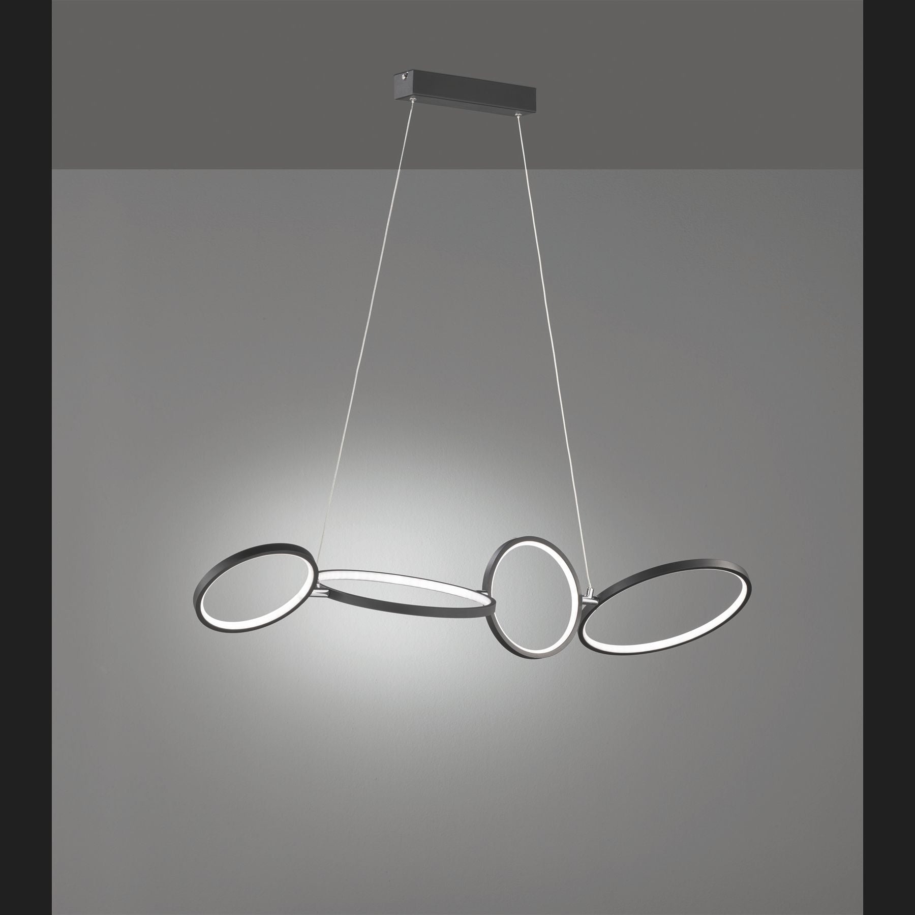 With its four rings of different diameters arranged side by side, the RONDO pendant light is a real eye-catcher. The pendant light has an integrated dimmer that is controlled via the light switch. This allows flexible control of the brightness of the LEDs installed on the inside of each circle. The 110 cm wide pendant light with a height of 150 cm is a true decorative element and stylishly enhances any living space. Thanks to the matt black colour scheme, the light can be combined with many furnishing styles. In addition, the luminaire features modern LED technology, which is characterised by high light quality and energy efficiency. Compared to conventional halogen lamps, up to 80% of energy costs can be saved. In addition, LED light sources have a long service life, produce less heat and protect the environment.