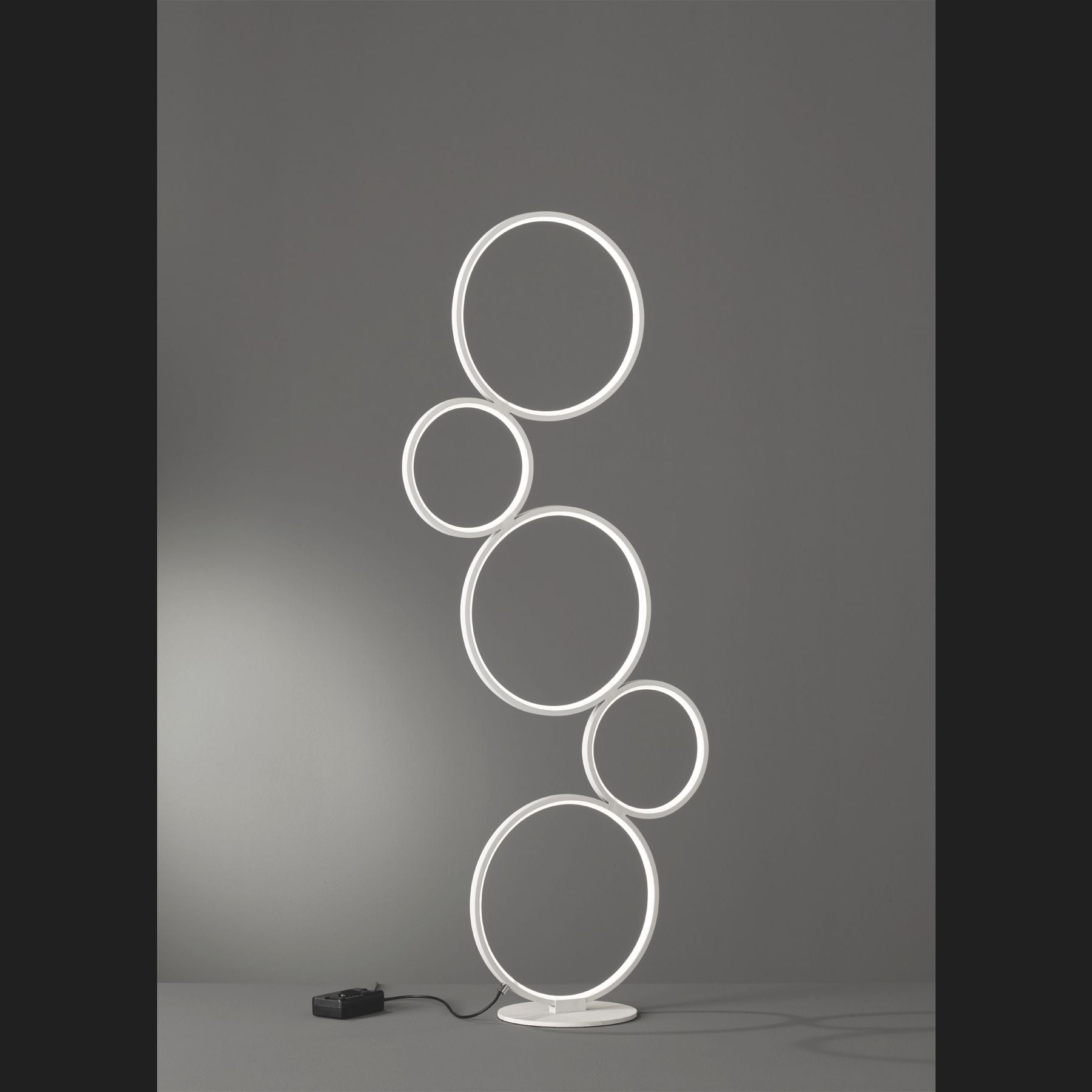 With its five stacked rings of different diameters, the RONDO floor lamp is a real eye-catcher. The floor lamp has an integrated dimmer that is controlled via the cord switch. This allows you to flexibly control the brightness of the LEDs installed on the inside of each circle. The 115 cm high floor lamp is a real decorative element and stylishly enhances any living space. Thanks to the matt white colour scheme, the light can be combined with many furnishing styles. In addition, the luminaire features modern LED technology, which is characterised by high light quality and energy efficiency. Compared to conventional halogen lamps, up to 80% of energy costs can be saved. In addition, LED light sources have a long service life, produce less heat and protect the environment.
