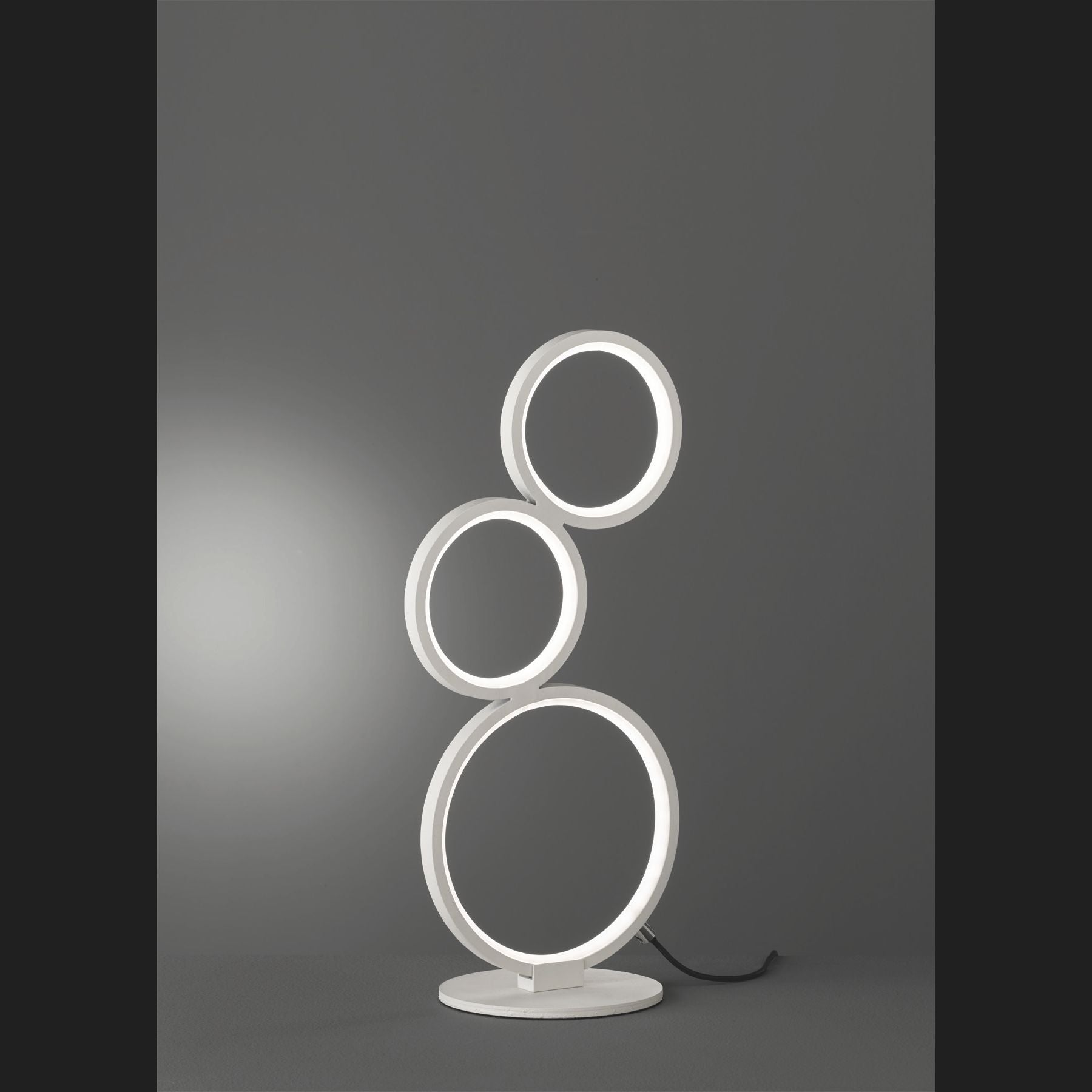 With its three stacked rings of different diameters, the RONDO table lamp is a real eye-catcher. The table lamp has an integrated dimmer that is controlled via the cord switch. This allows you to flexibly control the brightness of the LEDs installed on the inside of each circle. The 45 cm high table lamp is a real decorative element and stylishly enhances any living space. Thanks to the matt white colour scheme, the light can be combined with many furnishing styles. In addition, the luminaire features modern LED technology, which is characterised by high light quality and energy efficiency. Compared to conventional halogen lamps, up to 80% of energy costs can be saved. In addition, LED light sources have a long service life, produce less heat and protect the environment.