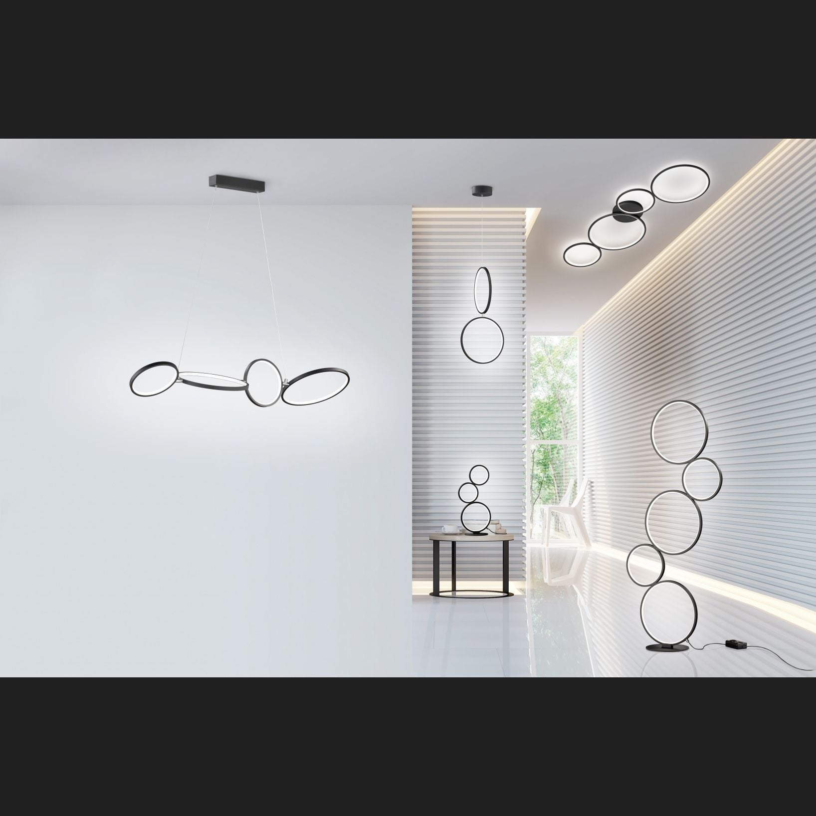 With its three stacked rings of different diameters, the RONDO table lamp is a real eye-catcher. The table lamp has an integrated dimmer that is controlled via the cord switch. This allows you to flexibly control the brightness of the LEDs installed on the inside of each circle. The 45 cm high table lamp is a real decorative element and stylishly enhances any living space. Thanks to the matt black colour scheme, the light can be combined with many furnishing styles. In addition, the luminaire features modern LED technology, which is characterised by high light quality and energy efficiency. Compared to conventional halogen lamps, up to 80% of energy costs can be saved. In addition, LED light sources have a long service life, produce less heat and protect the environment.