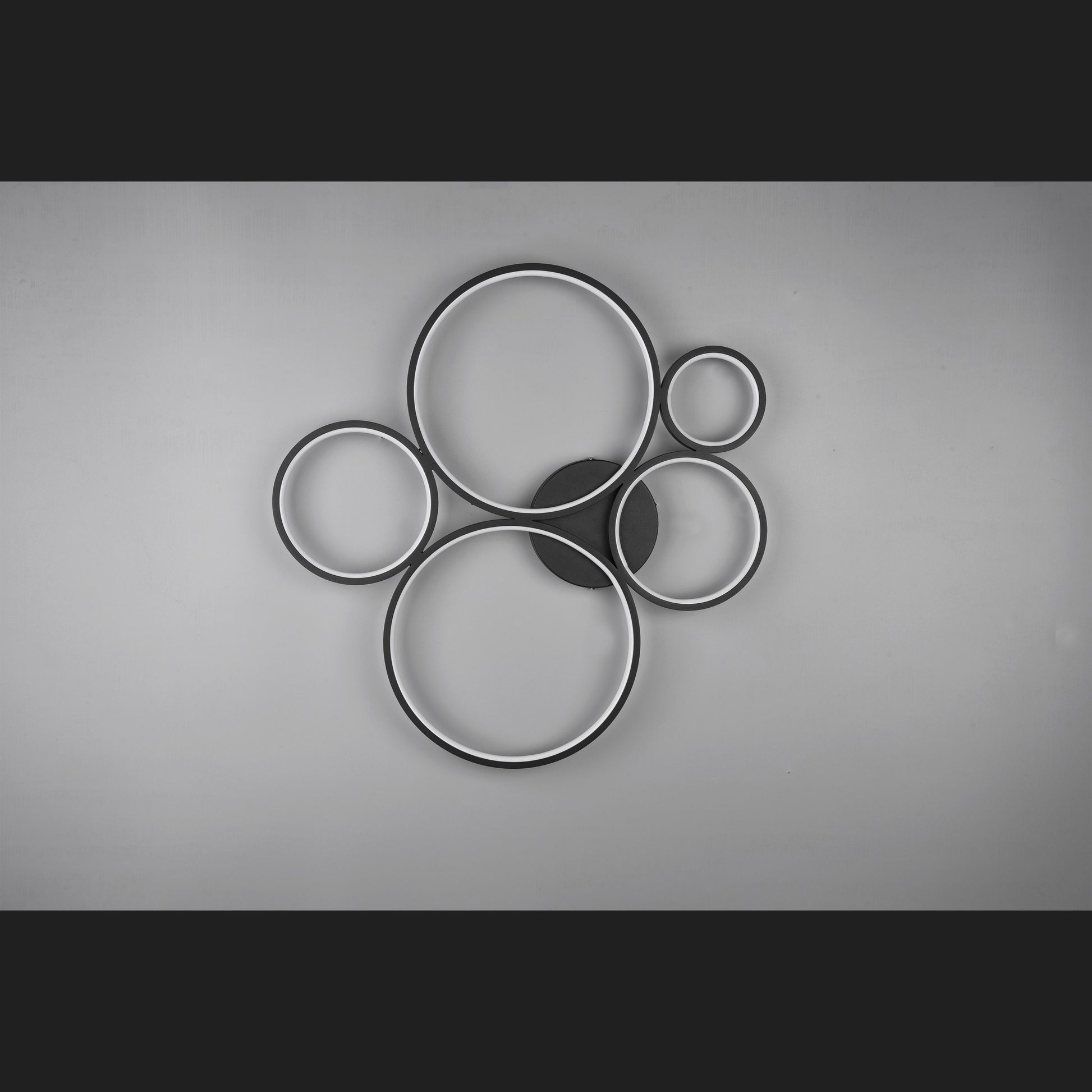 With its five hanging rings of different diameters, the RONDO ceiling light is a real eye-catcher. The ceiling light has an integrated SWITCH dimmer, which is controlled via the light switch. This allows the brightness of the LEDs installed in the inside of each circle to be controlled in three stages using the light switch. The ceiling light is a true decorative element and stylishly enhances any living space. Thanks to the matt black colour scheme, the light can be combined with many furnishing styles. For energy-saving lighting, it is recommended to use an LED illuminant. These are an optimal alternative to conventional halogen lamps and stand for a high quality of light and energy savings of up to 80%. In addition, LED lamps help you benefit from a long service life, low heat generation and at the same time protect the environment.