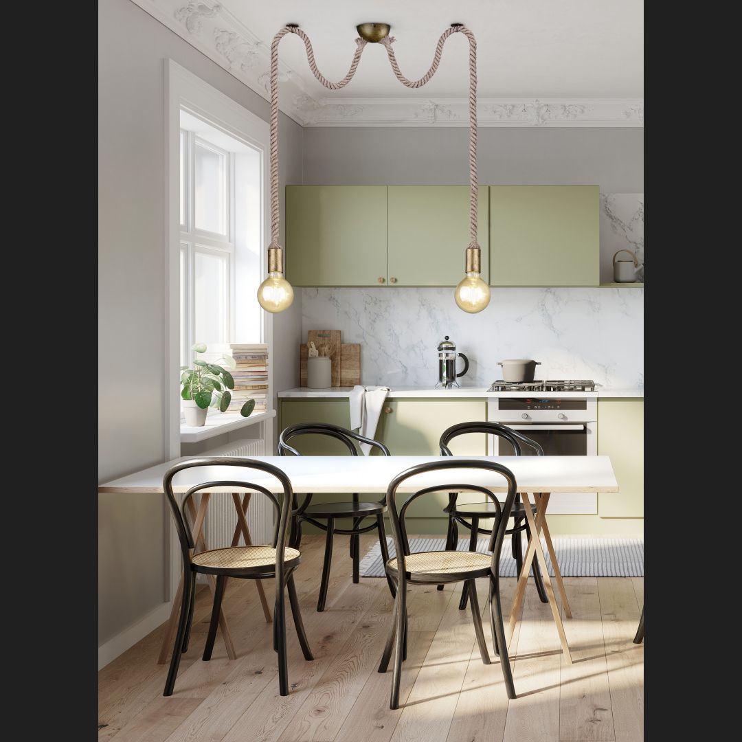 Absolutely vintage: the coarse linen suspension with elegant brass accents exudes trendy retro charm and is an absolute eye-catcher. The single-flame pendant can be placed individually or several in a row. Above the bar or centred above a small table, the pendant becomes a stylish design element. The pendant light should be complemented with a matching retro filament bulb to retain the charm of the light. The individual pendants each have a suspension length of 150cm and can be adjusted in length during installation by attaching the loops that hold the two cables to the ceiling as required. The beige linen look is stylishly complemented by elegant brass accents and not only fulfils the function of a lamp, but also that of a decorative element. For energy-saving lighting, it is recommended to use an LED illuminant. These are an optimal alternative to conventional halogen lamps and stand for a high quality of light and energy savings of up to 80%. In addition, LED lamps help you benefit from a long service life, low heat generation and at the same time protect the environment.