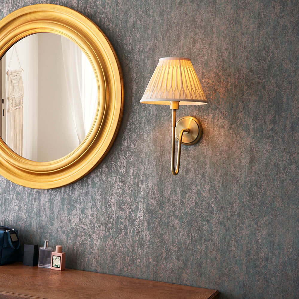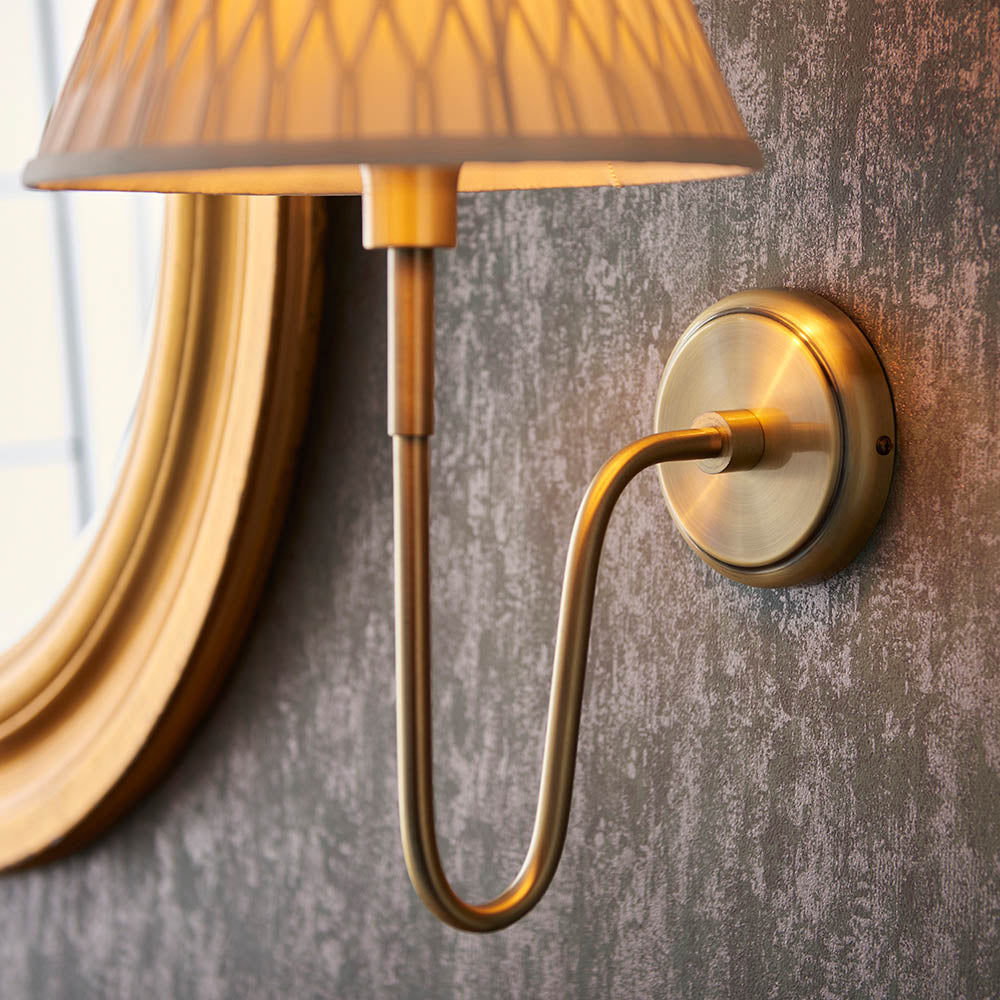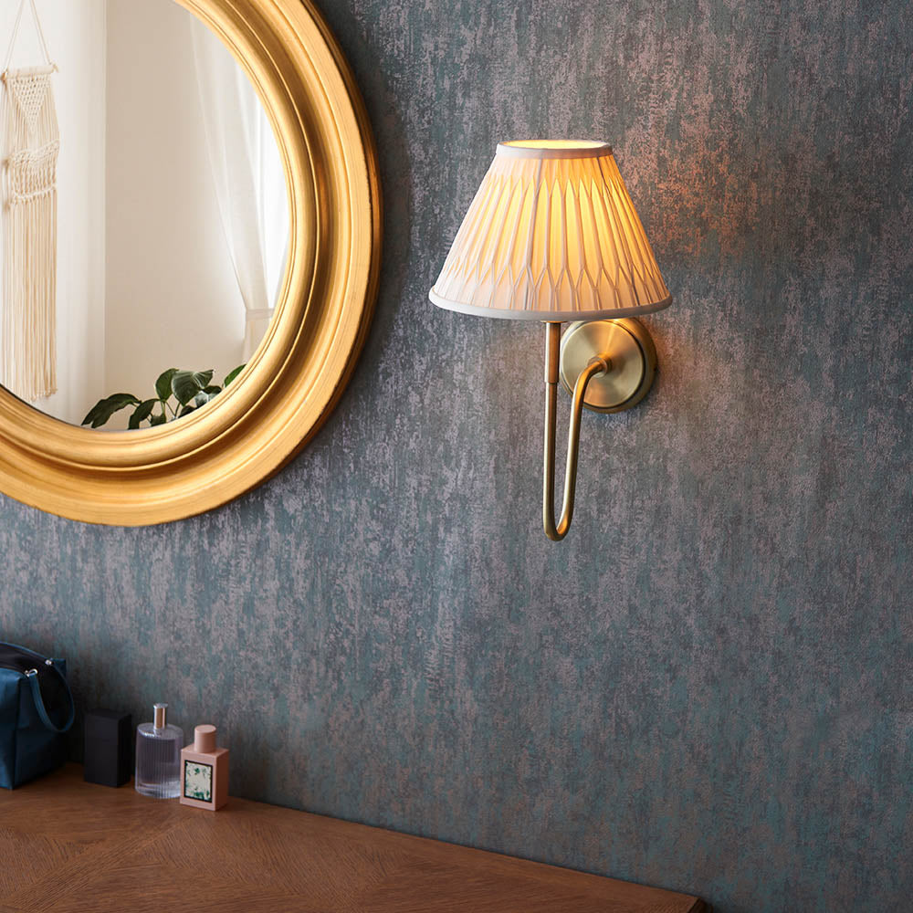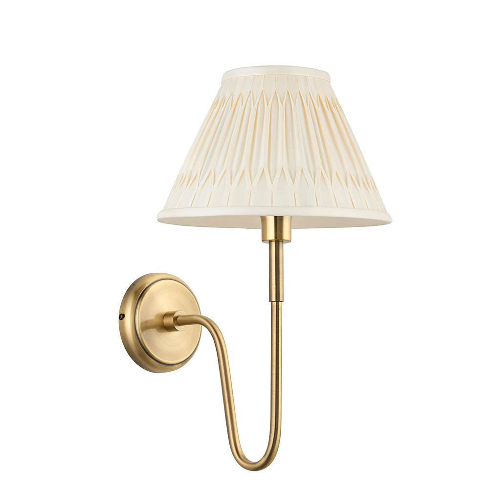 *Incorporates 10% saving when base and shade bought together.A new take on a timeless classic, elegant and on trend antique brass plate wall fitting. Featuring a beautifully handmade ivory silk 10 inch double pinch pleat tapered shade.