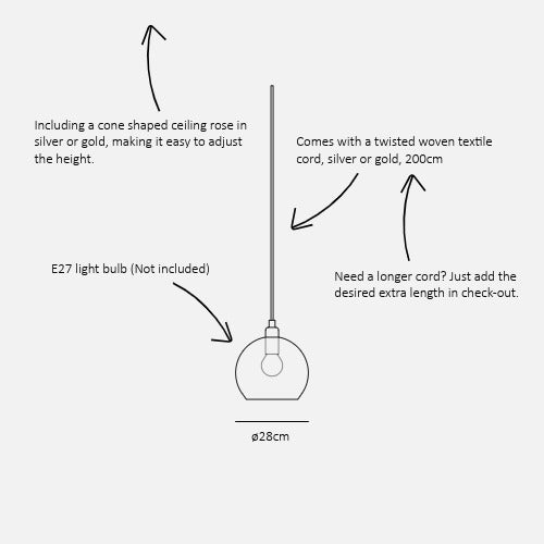 Finished with brass details in your choice of gold or silver, Rowan uses an E27 lightbulb (not included) and comes with a 200 cm cord.