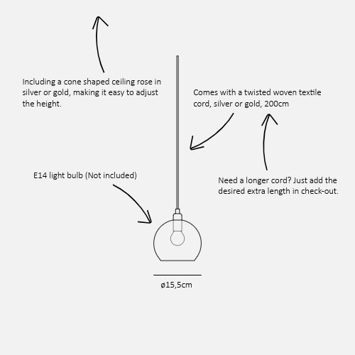 Finished with brass details in your choice of gold or silver, Rowan uses an E14 lightbulb (not included) and comes with a 200 cm cord.