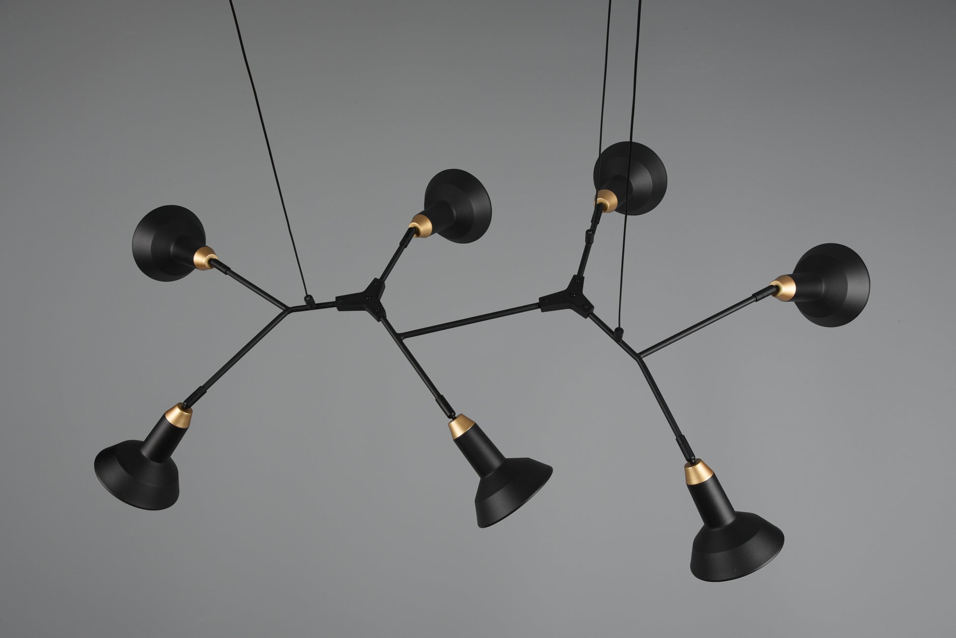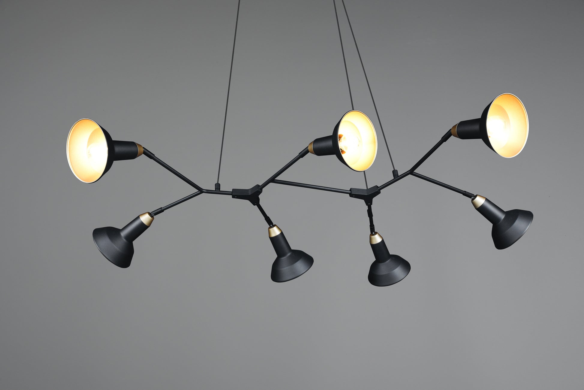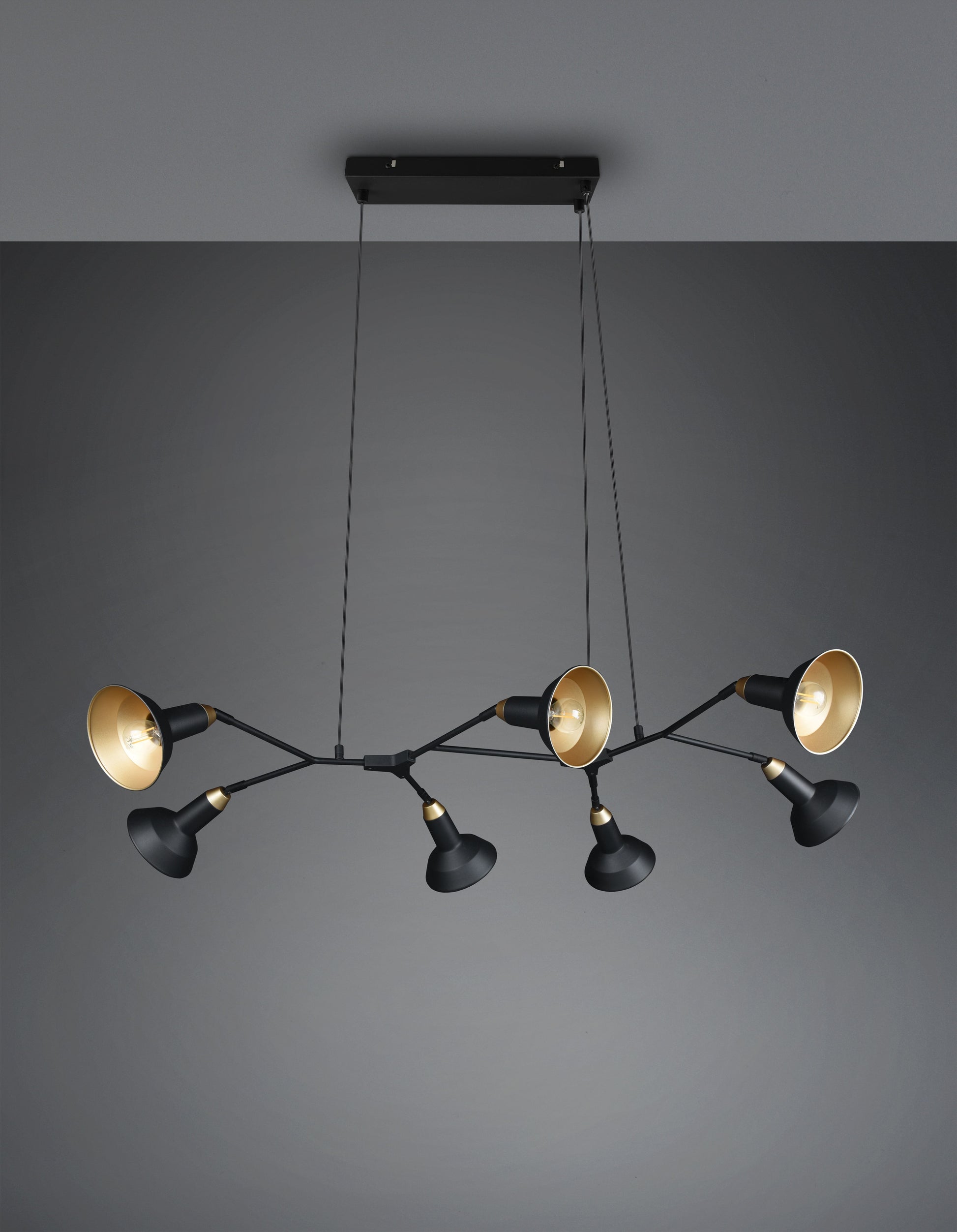The luminaires of the ROXIE series have a modern design and are a real eye-catcher. Mounted centrally above the dining table, the seven-light pendant luminaire provides optimal lighting conditions and gives your home a cosy ambience. The luminaire is in stylish black matt and gold, exuding lightness and elegance. For energy-saving lighting, it is recommended to use an LED illuminant. These are an optimal alternative to conventional halogen lamps and stand for a high quality of light and energy savings of up to 80%. In addition, LED lamps help you benefit from a long service life, low heat generation and at the same time protect the environment.