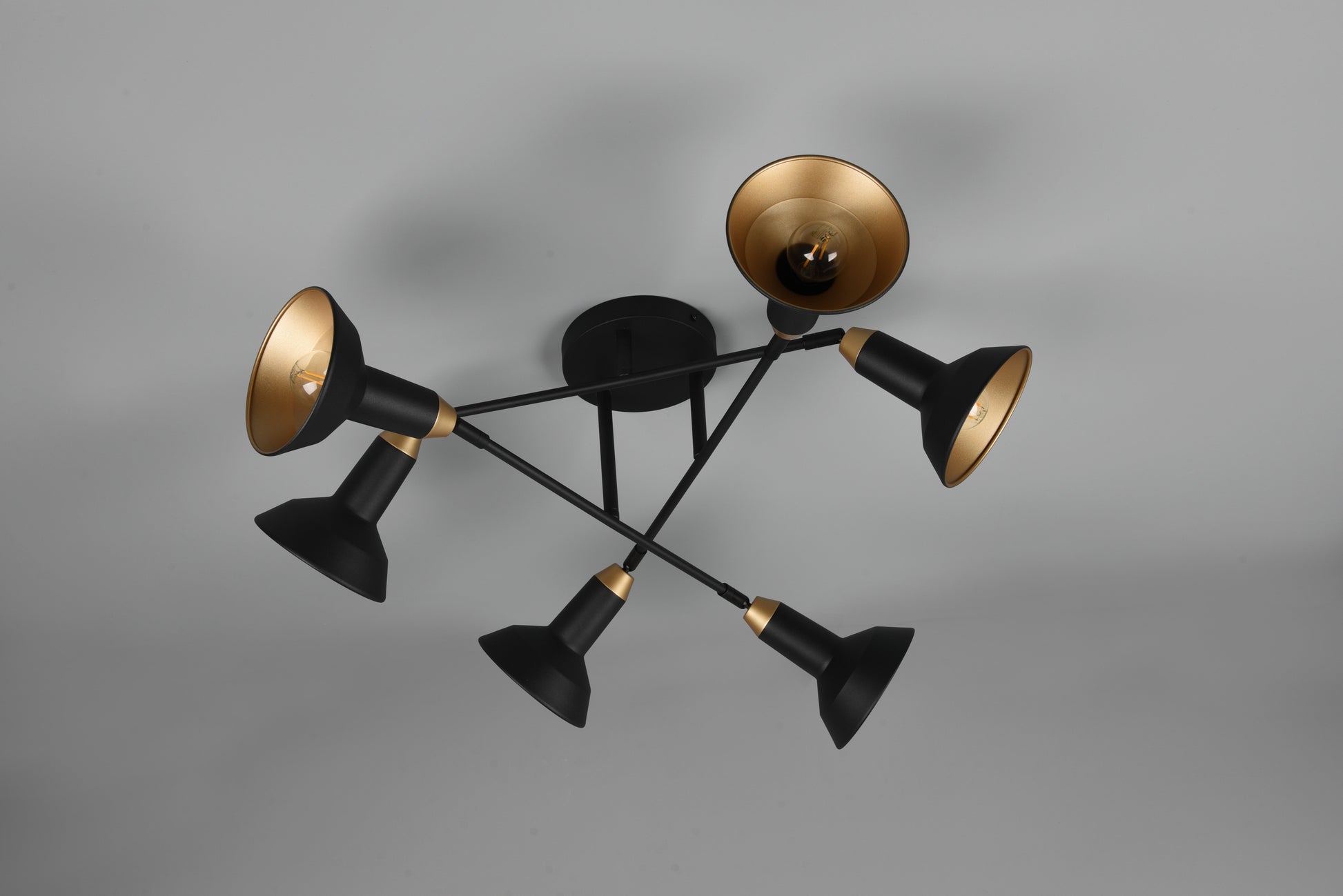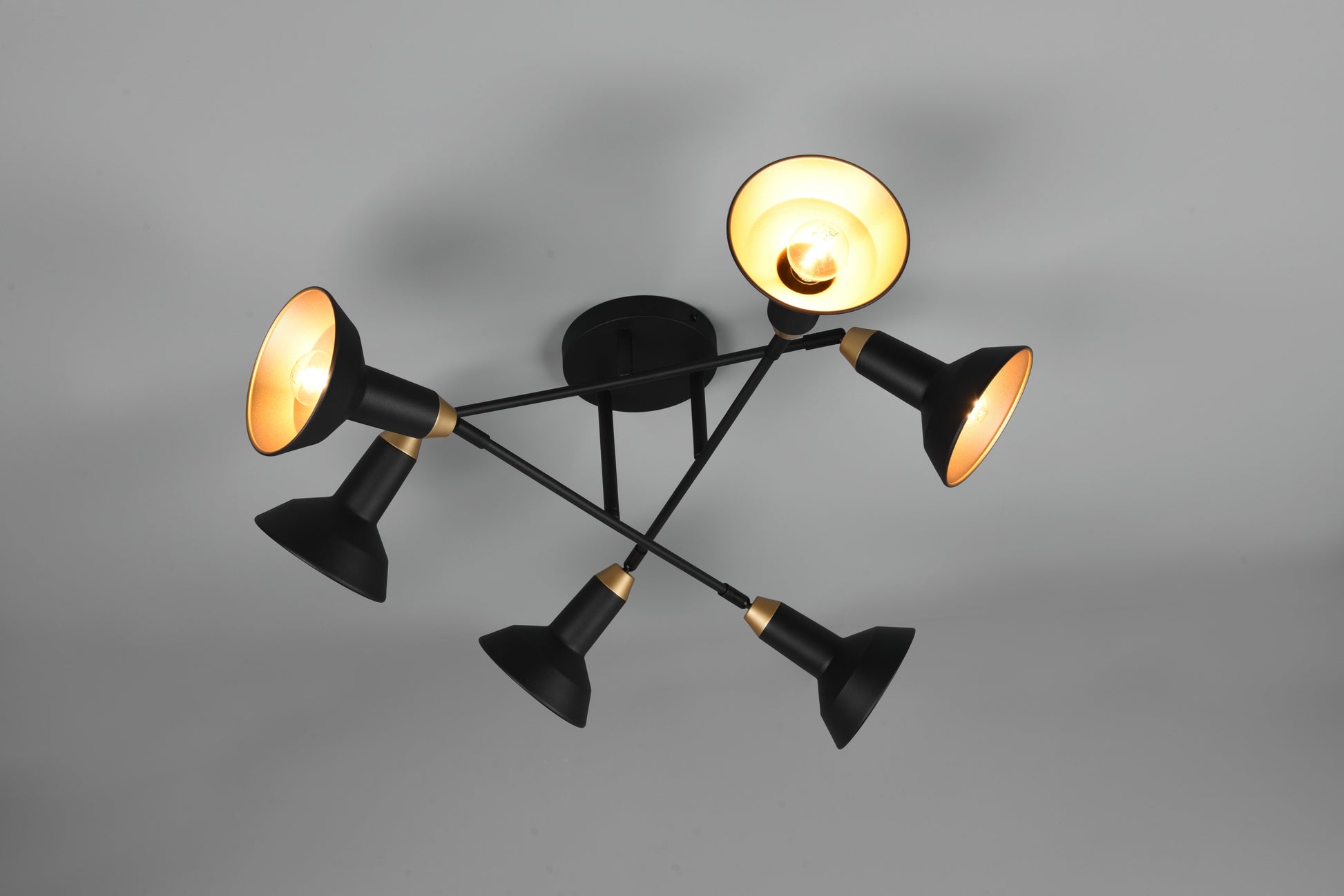 The luminaires of the ROXIE series have a modern design and are a real eye-catcher. Mounted centrally above the dining table or in the living area, the six-light ceiling lamp provides optimal lighting conditions and gives your home a cosy ambience. The luminaire is in stylish black matt and gold, exuding lightness and elegance. For energy-saving lighting, it is recommended to use an LED illuminant. These are an optimal alternative to conventional halogen lamps and stand for a high quality of light and energy savings of up to 80%. In addition, LED lamps help you benefit from a long service life, low heat generation and at the same time protect the environment.