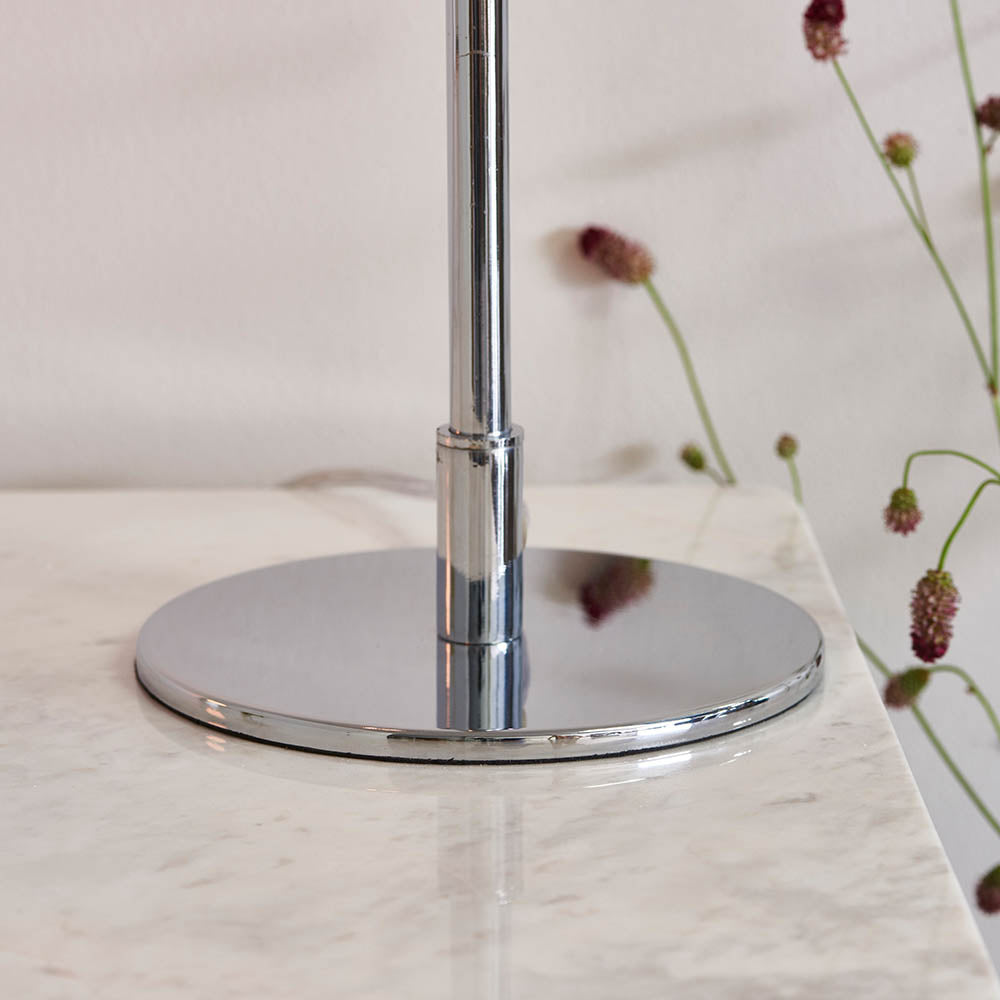 An 'on trend' mid century inspired, clean line table light. Finished in polished chrome, perfect when paired with filament LED lamps to create a modern look for today's living spaces.