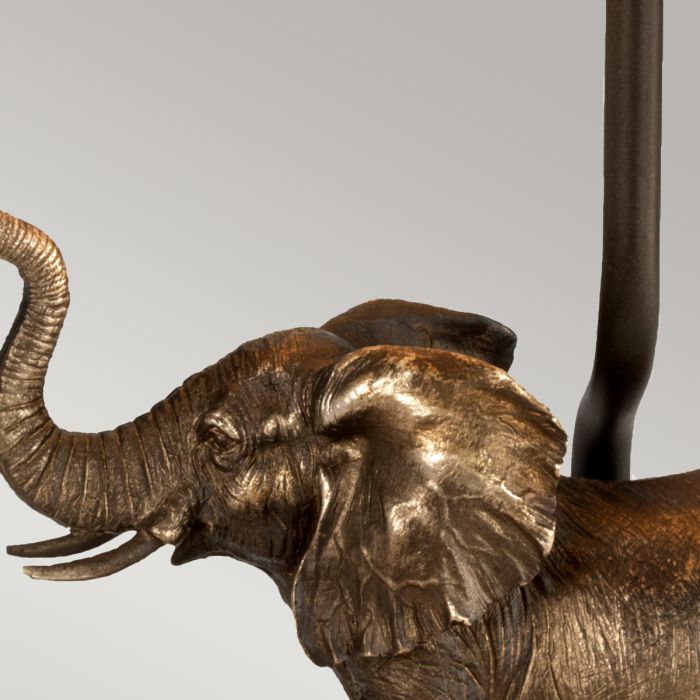 Elephant statuette table lamp in Bronze Patina finish. This portable is complete with a 10" Laminated Oval Natural Hessian Shade. LSUK066