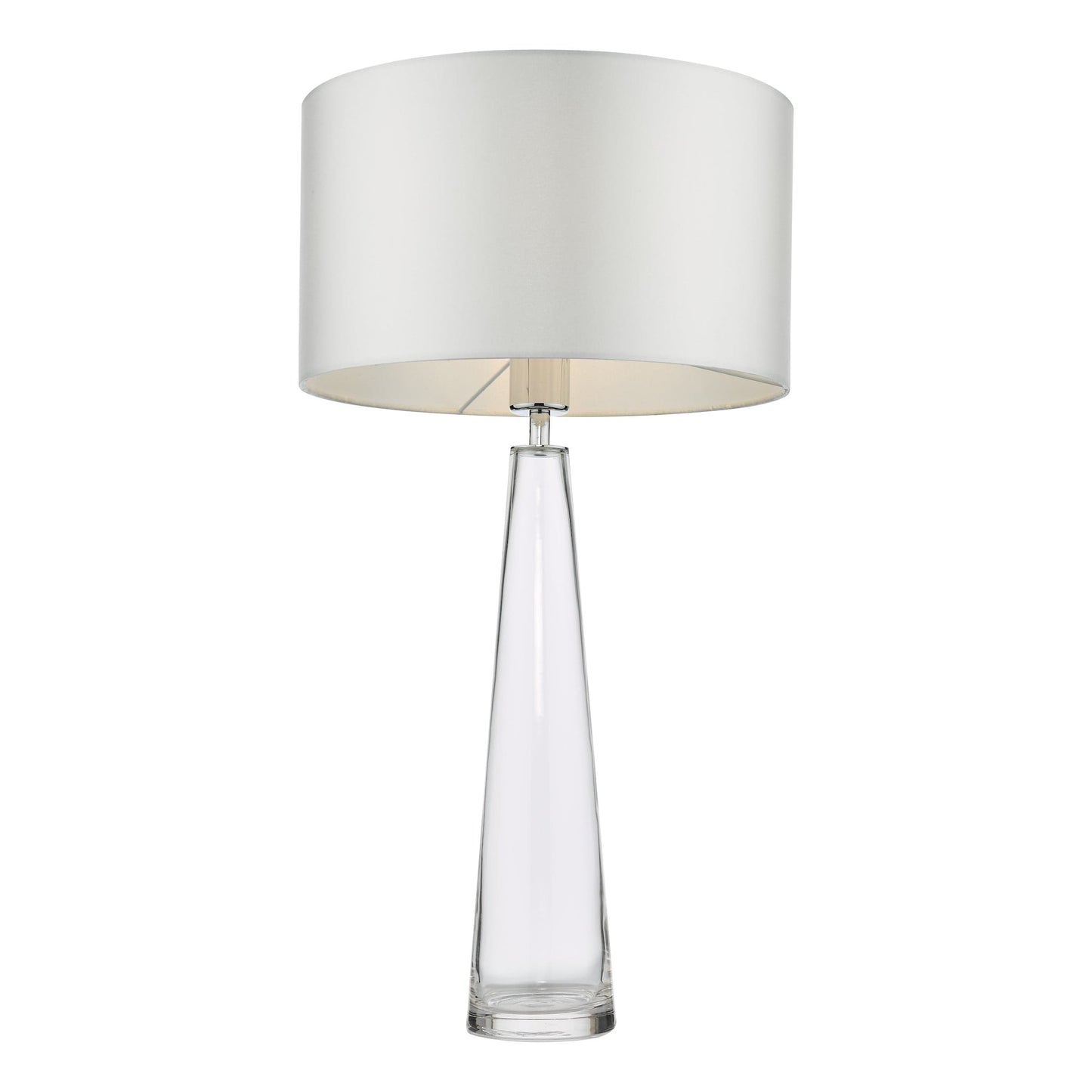 The Samara clear glass table lamp is an elegant tapering hand made glass table lamp with a heavy glass base. Finished with an ivory twisted braided cable and polished chrome metal work.