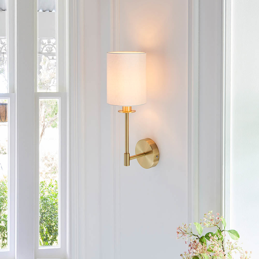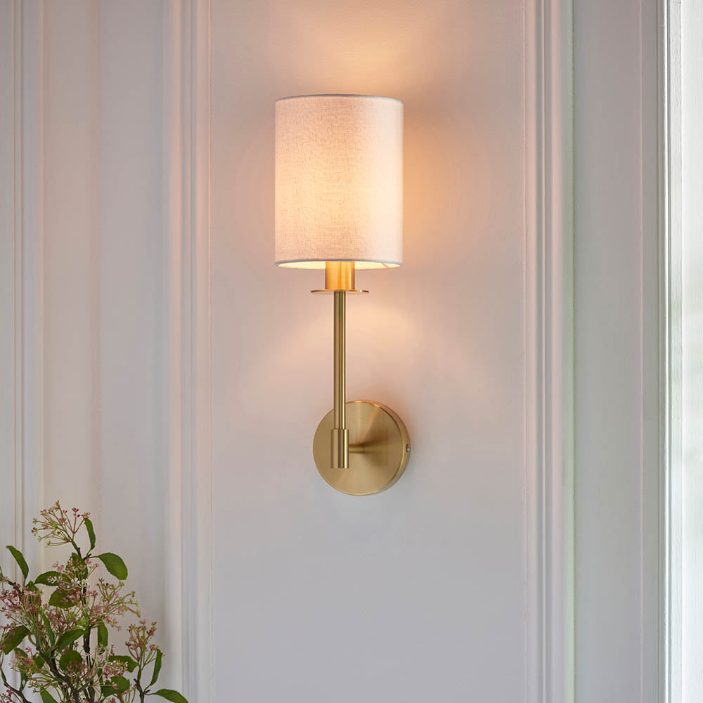 A simple and easy to place modern classic style wall light. Finished in satin brass with vintage white fabric shade.