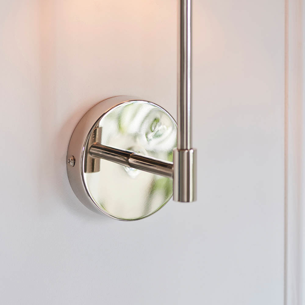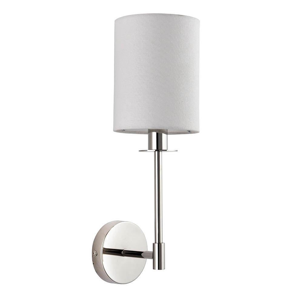 A simple and easy to place modern classic style wall light. Finished in polished nickel with vintage white fabric shade.