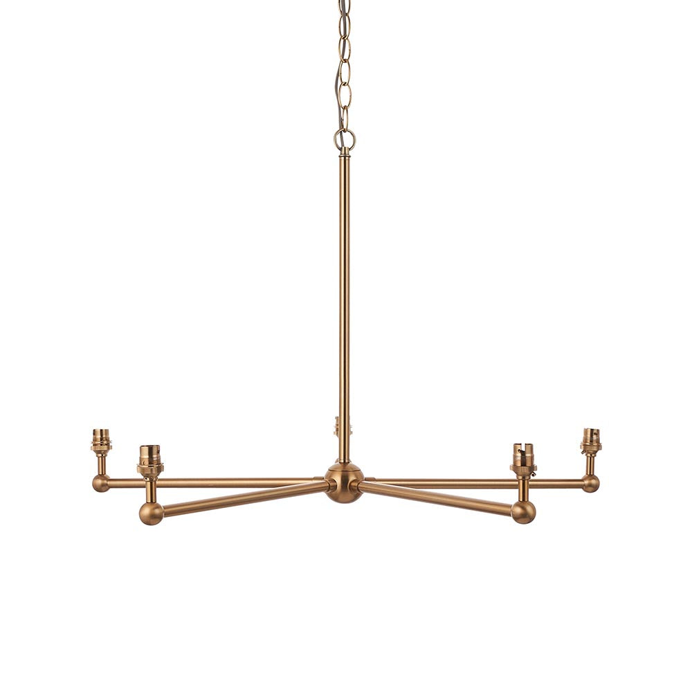 An elegant 5 light classic pendant fitting featuring B22 lamp holders for an authentic feel, finished in brushed aged brass, suspended from height adjustable 1.5m chain with grey braided fabric flex. This is a fitting only pendant, pair with five of our 16cm or 20cm decorative fabric shades to complete the look. Matching wall light, table light and linear pendant also available.