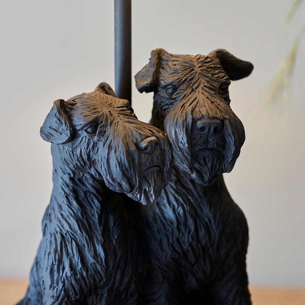 A celebration of man's best friend - a friendly duo sit at the base of this table lamp perfect for dog lovers. High quality detailed resin figurine finished in a subtle matt black pair with a natural fabric shade to make it an easy addition to any interior style.