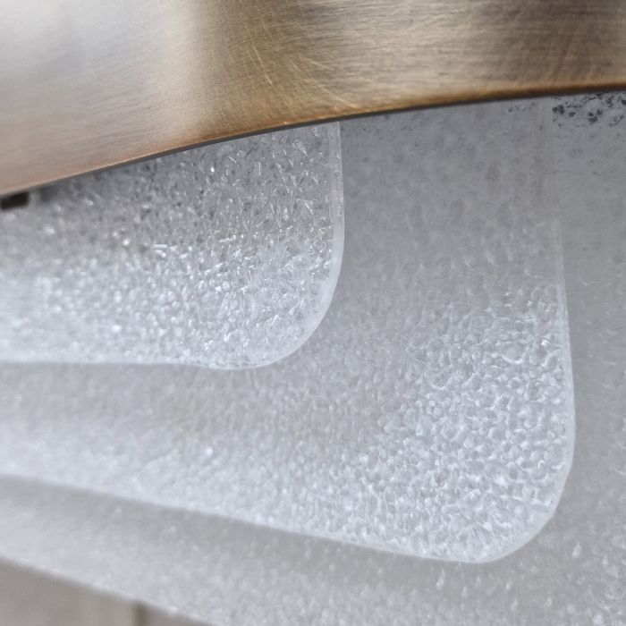 Inspired by the way light shines on a waterfall, the LED chandelier in Natural Brass takes a contemporary approach to classic mid-century shapes, with soft curves juxtaposed against layers of textured glass. The LED light reflects off of these surfaces, bringing brilliant illumination to a space.