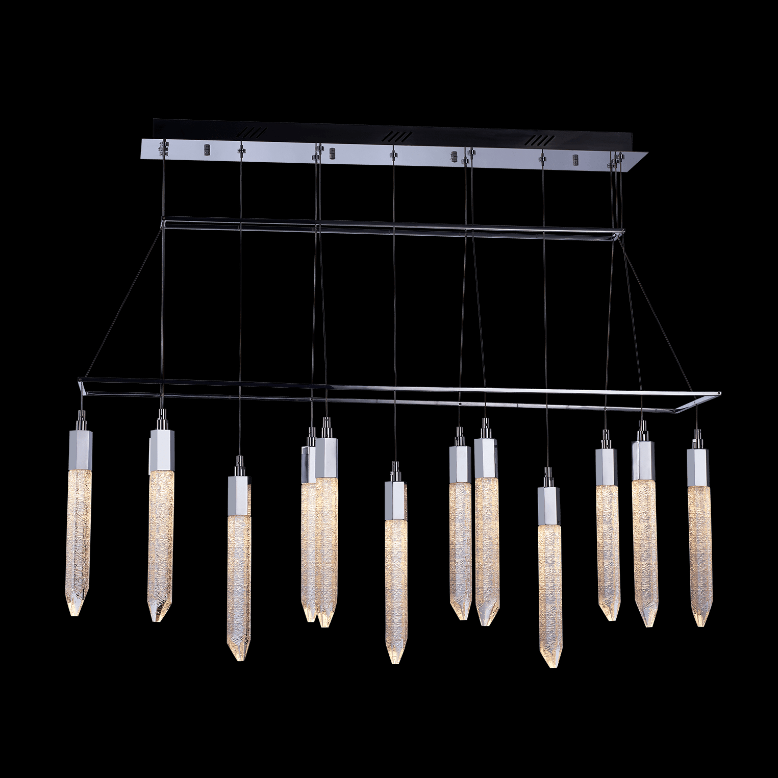 Illuminati Lighting 13 light LED Crystal Shard features a ceiling bar in a polished chrome finish with thin suspension wires holding 13 organic ice glass shades and two decrotive rectangular adjustable spacers.