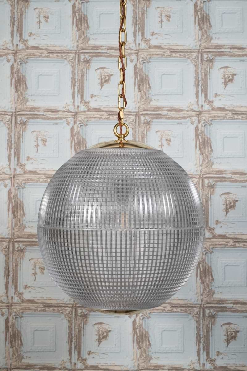 Inspired by the 1950s Paris Holophane Globe Street Light, this iconic prismatic sphere design once lit the thoroughfares of the French Capital. Transformed from the practical to the sophisticated and stylish, the textured prismatic glass of the Hollen Globe provides a combination of up light and down light which projects a wonderfully even distribution of light, without casting shadow or glare. The solid brass base, cap and chain, reinforces the quality of this impressive, iconic pendant.