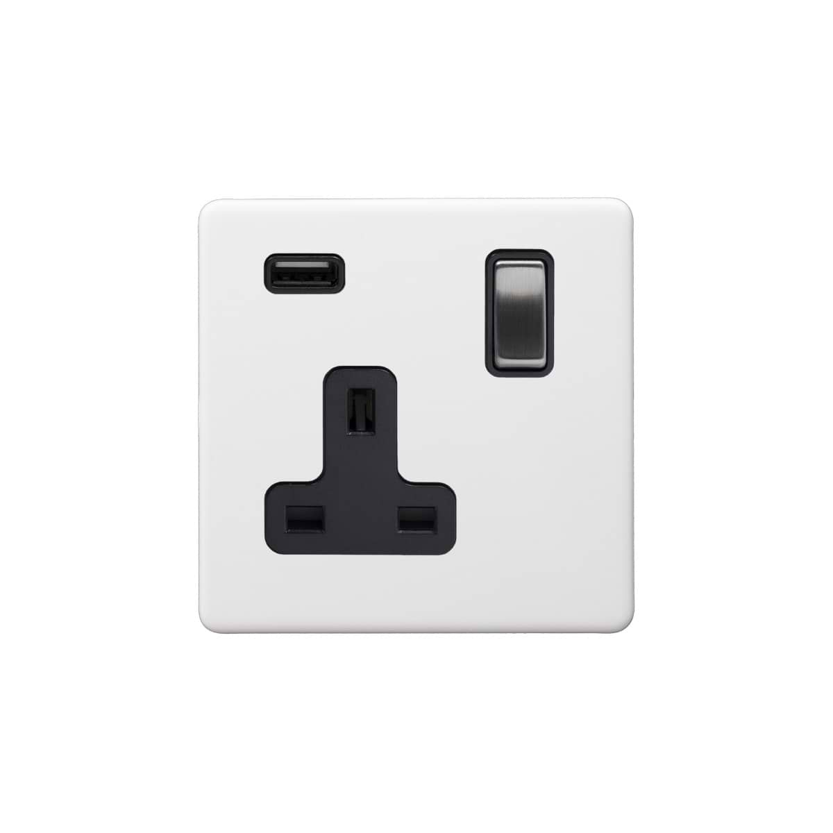 Soho Lighting Primed Paintable 13A 1 Gang Double Pole Switched USB Socket (USB Output 2.1amp) with Brushed Chrome Switch and Black Insert