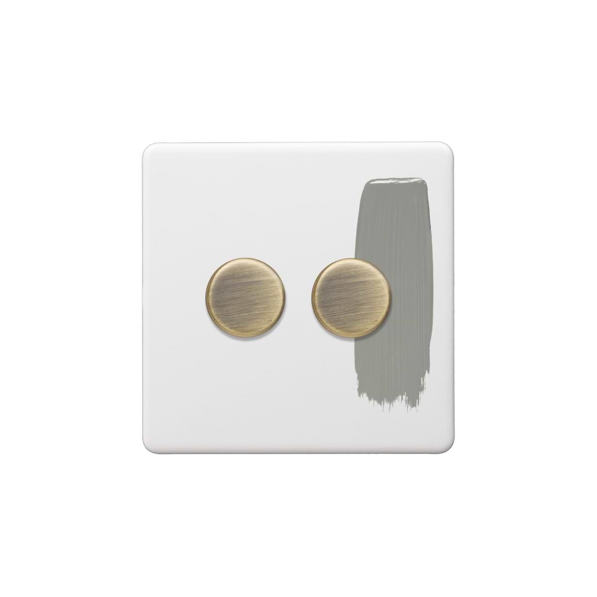This Primed Paintable 2 Gang 2 Way Trailing Edge Dimmer Switch 150W LED (300w Halogen/Incandescent) with Antique Brass Switch is a luxury paintable primed plate with a antique brass switch. This innovative design allows you to match your switches and sockets with your preferred wall colour for a seamless finish.