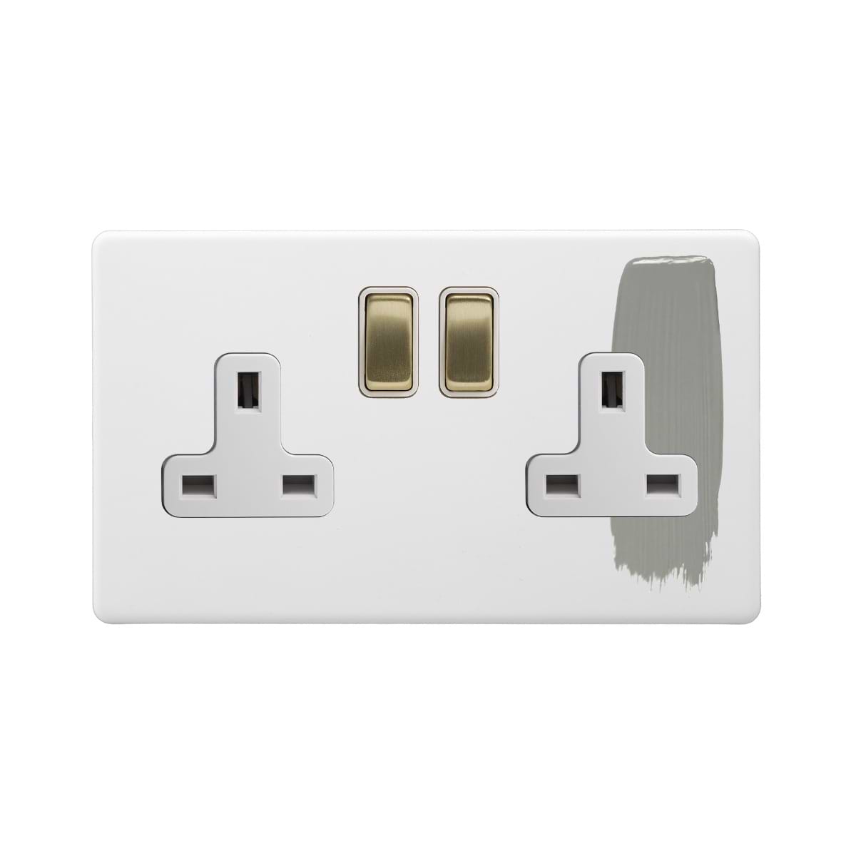 This Primed Paintable 2 Gang Socket 13A Double Pole with with Brushed Brass Switch with White Insert is a luxury paintable primed plate with a brushed brass switch. This innovative design allows you to match your switches and sockets with your preferred wall colour for a seamless finish.