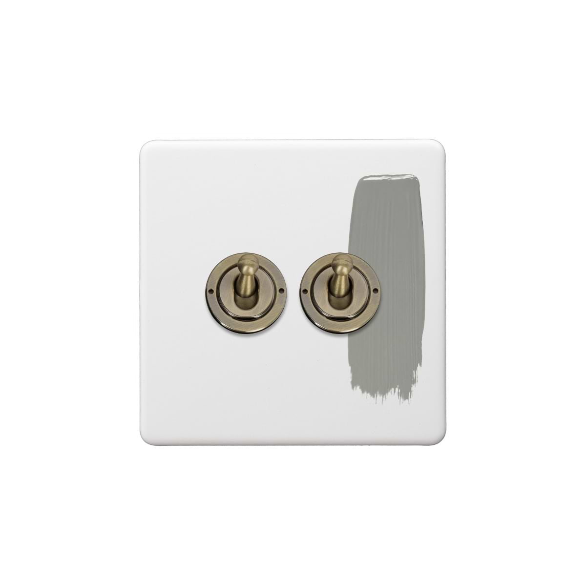 This Primed Paintable 2 Gang Toggle Switch 2-Way with Antique Brass Switch is a luxury paintable primed plate with a antique brass switch. This innovative design allows you to match your switches and sockets with your preferred wall colour for a seamless finish.