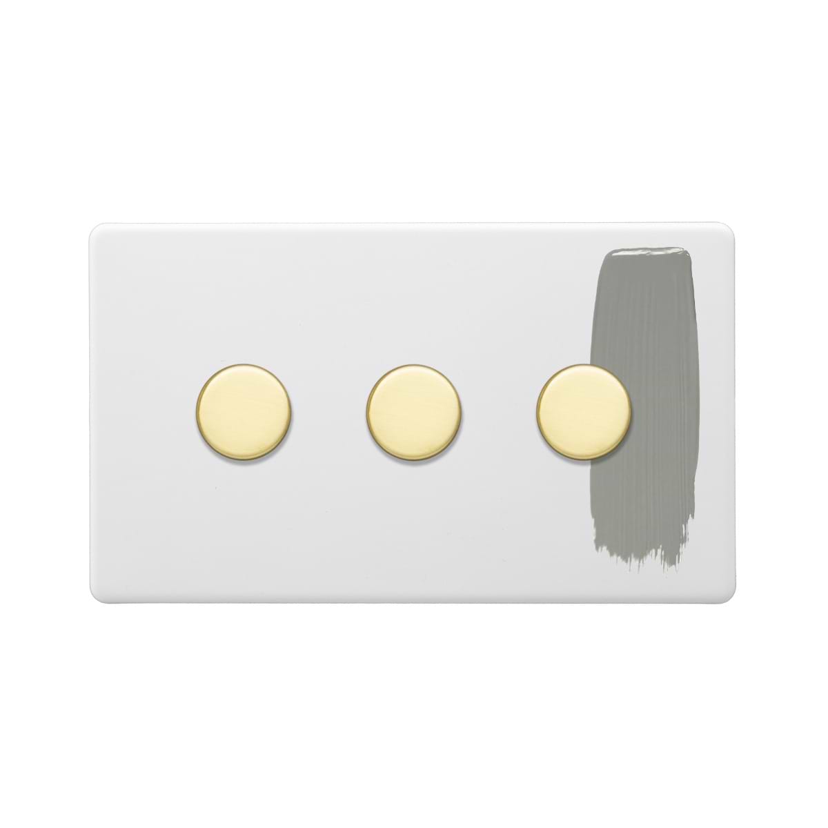This Primed Paintable 3 Gang 2 Way Trailing Edge Dimmer Switch 150W LED (300w Halogen/Incandescent) with Brushed Brass Switch is a luxury paintable primed plate with a brushed brass switch. This innovative design allows you to match your switches and sockets with your preferred wall colour for a seamless finish.