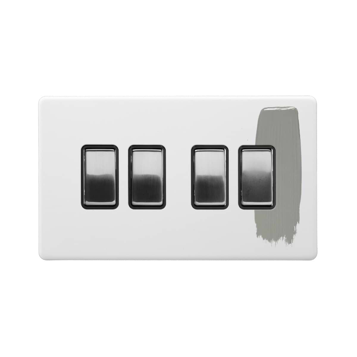 This Primed Paintable 4 Gang 2 Way 10A Light Switch with Brushed Chrome Switch and Black Insert is a luxury paintable primed plate with a brushed chrome switch. This innovative design allows you to match your switches and sockets with your preferred wall colour for a seamless finish.
